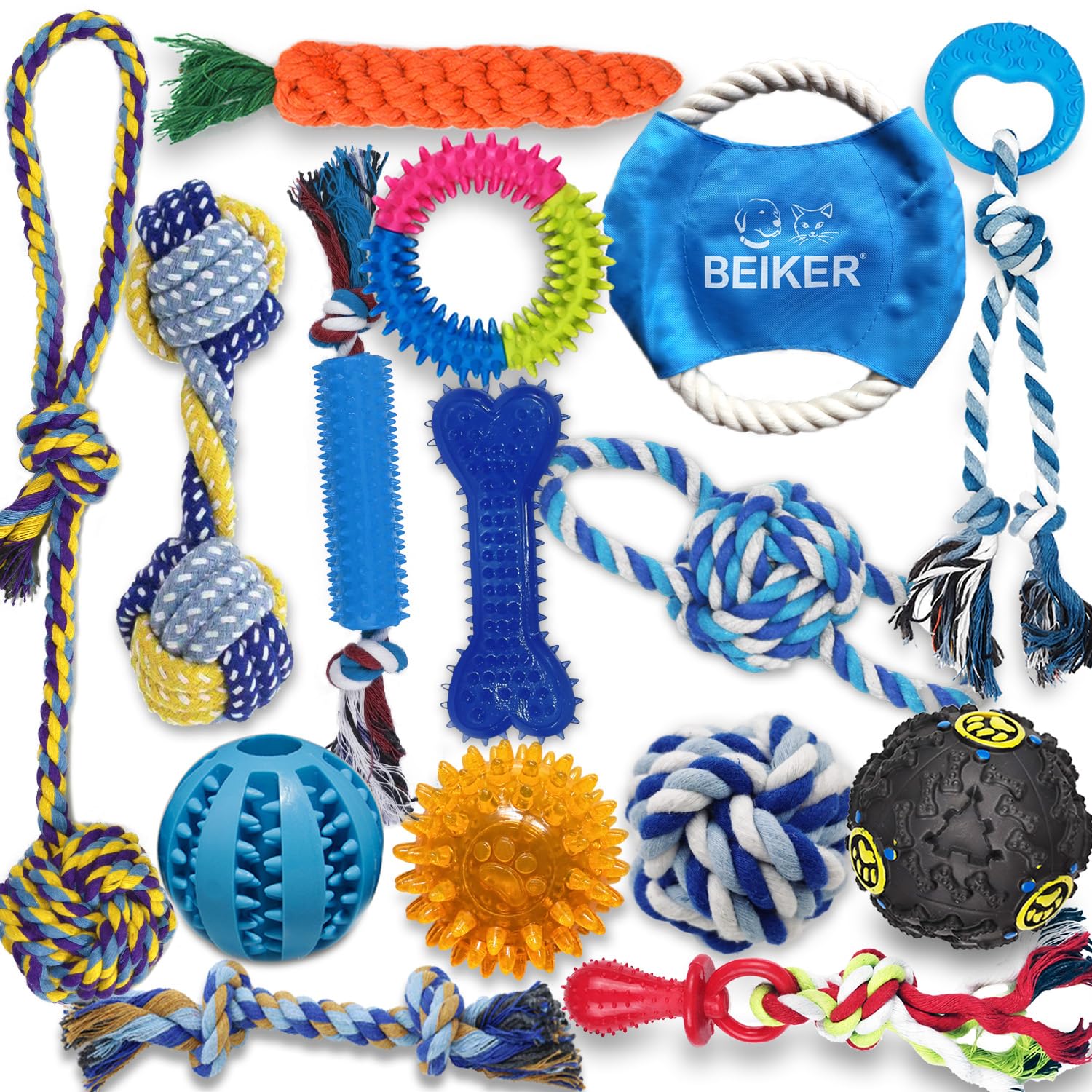 Beiker Dog Teething Chew Toys - 15 Pack Small Medium Breed Puppy Toy, Variety Dogs Rope Chew Toys Bundle for Boredom, Pet Interactive Squeaky Treat Dispensing Ball for Puppies
