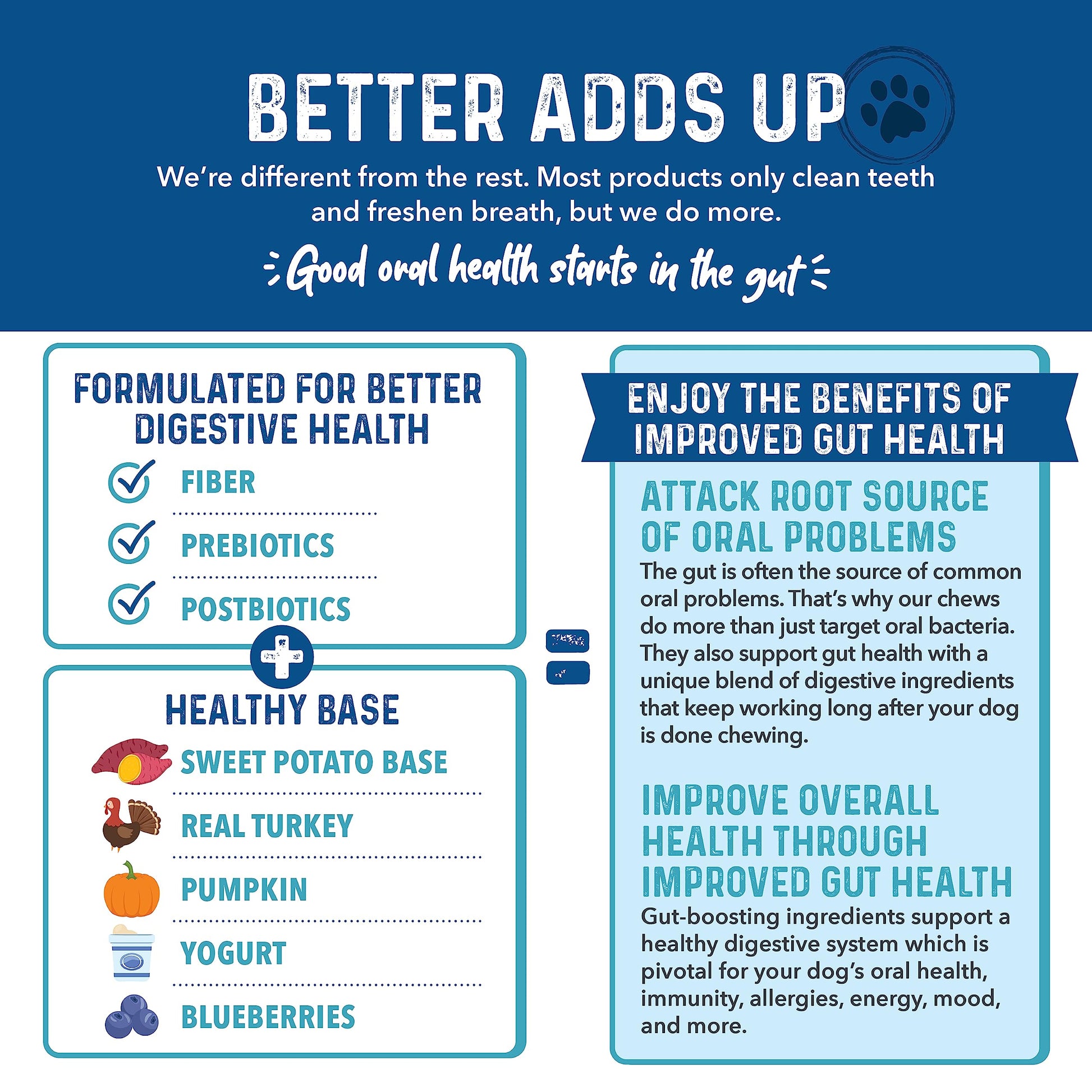 Our dental sticks for dogs use a unique blend of digestive ingredients to maintain a healthy gut-oral axis long after your dog is done chewing. Improve overall health with gut boosting ingredients that support a healthy digestive system – which is pivotal for your dog’s oral health, immunity, allergies, energy, mood, and more. Try our tiny size if you need dental chews for small dogs.