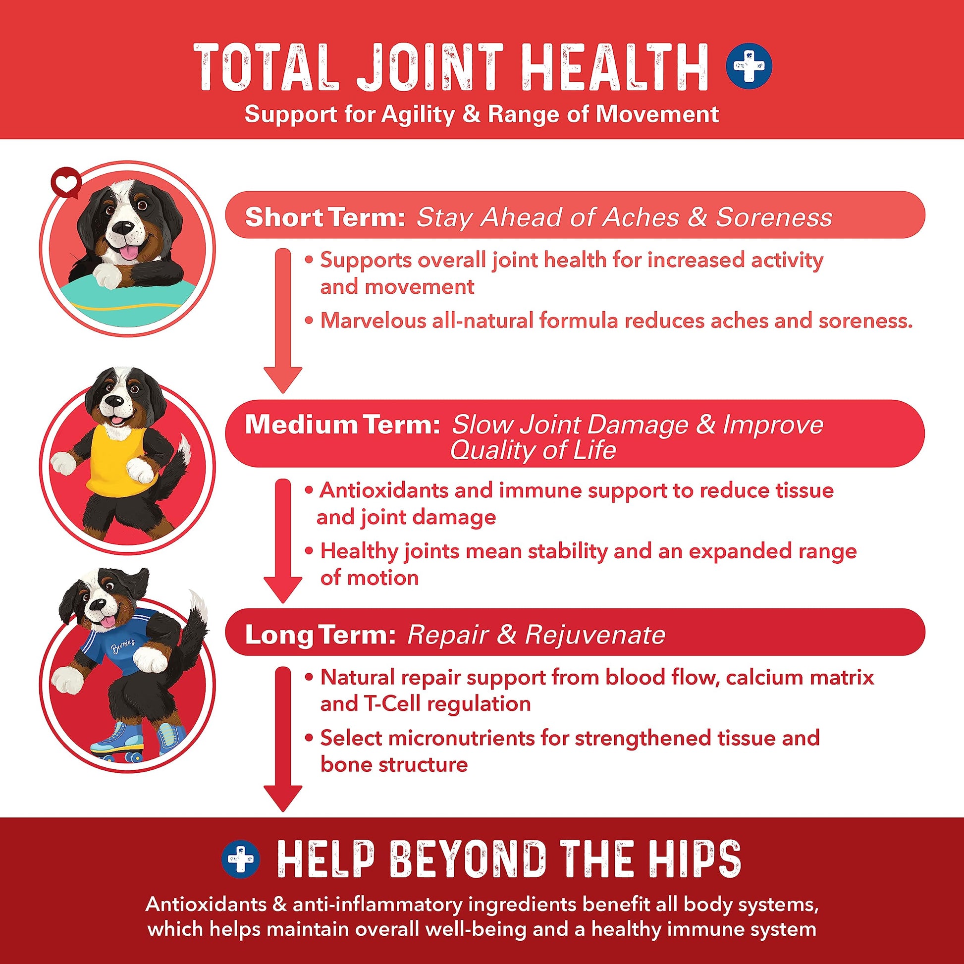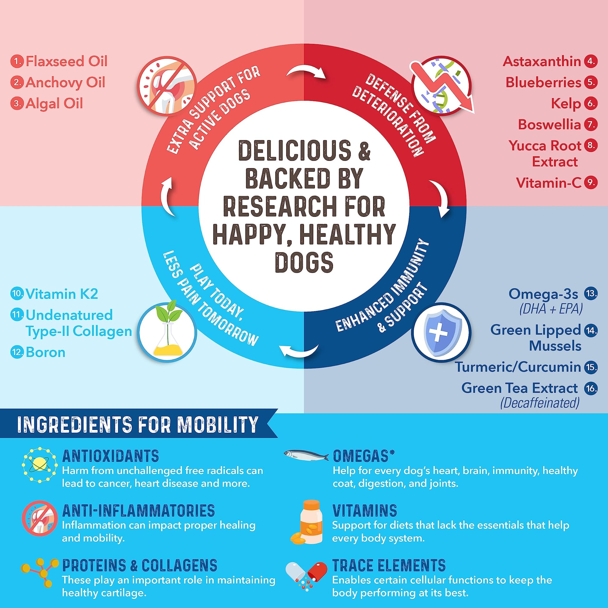 - CLEAN, TRUSTED & SAFE: All-natural, tastes great, no artificial colors or flavors, no corn or wheat, and easy to digest. Rooted in dog hip, joint and mobility care science. GMP and SQF certified, quality tested, and made in the USA.