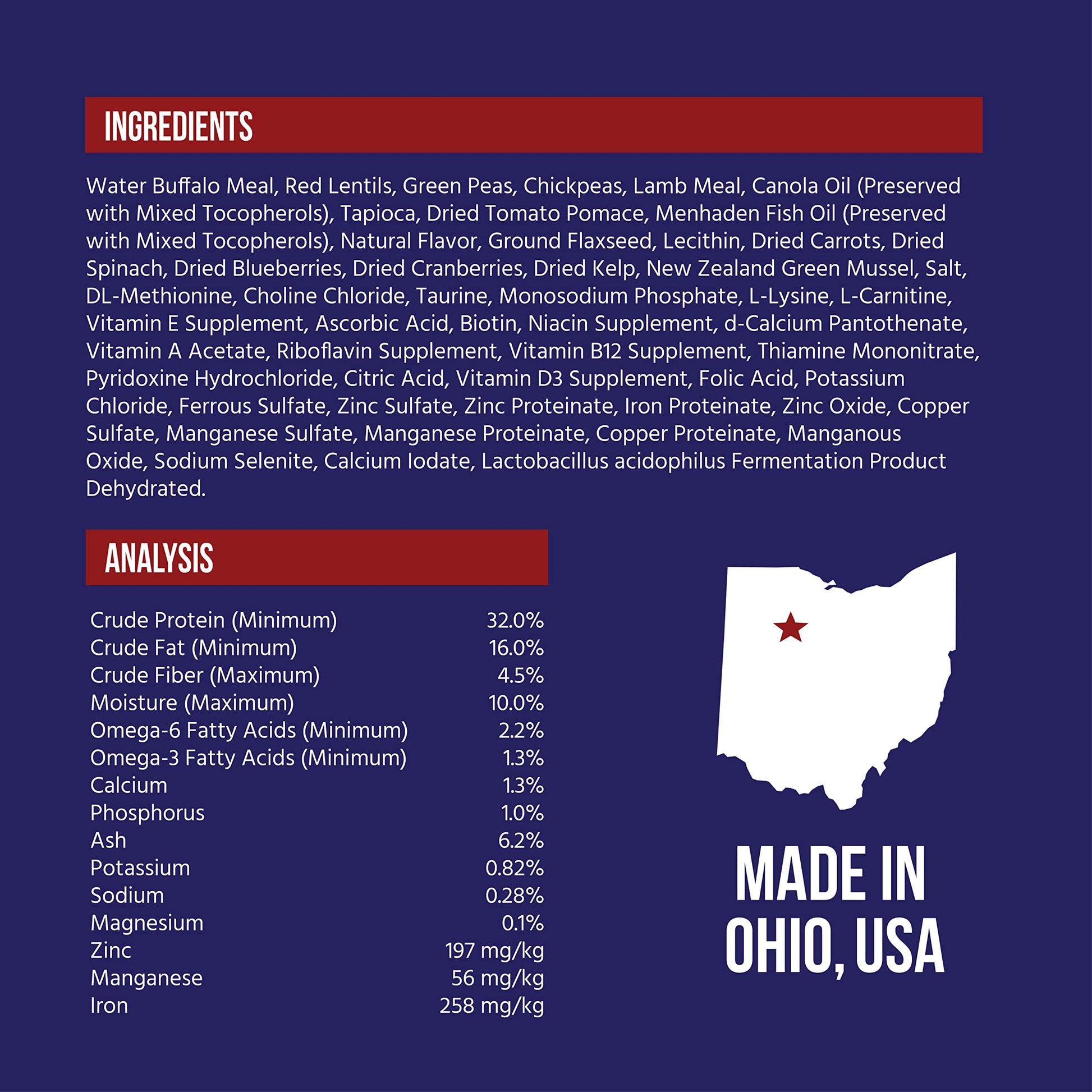 Details: A holistic blend of protein-rich buffalo and lamb, antioxidant-rich vegetables and probiotics for proper digestion. Enriched with taurine. Buffalo is a unique protein source that when combined with other healthful ingredients makes the perfect formulation for dogs struggling with sensitivities (skin, ear, etc.). Formulated for all sizes and life stages (puppy through senior).