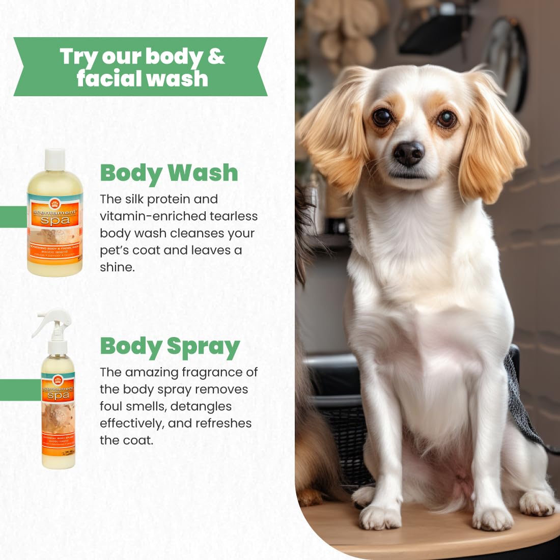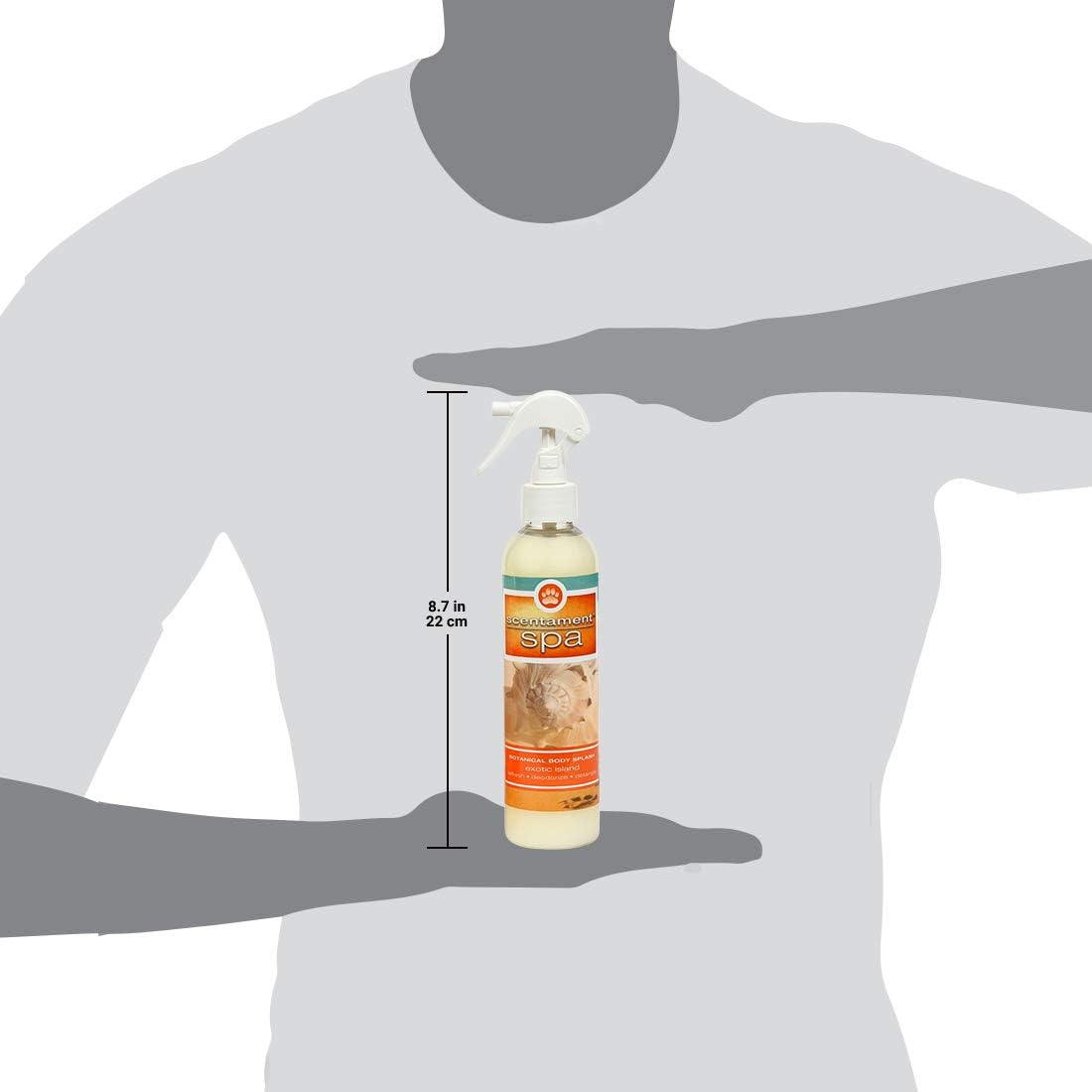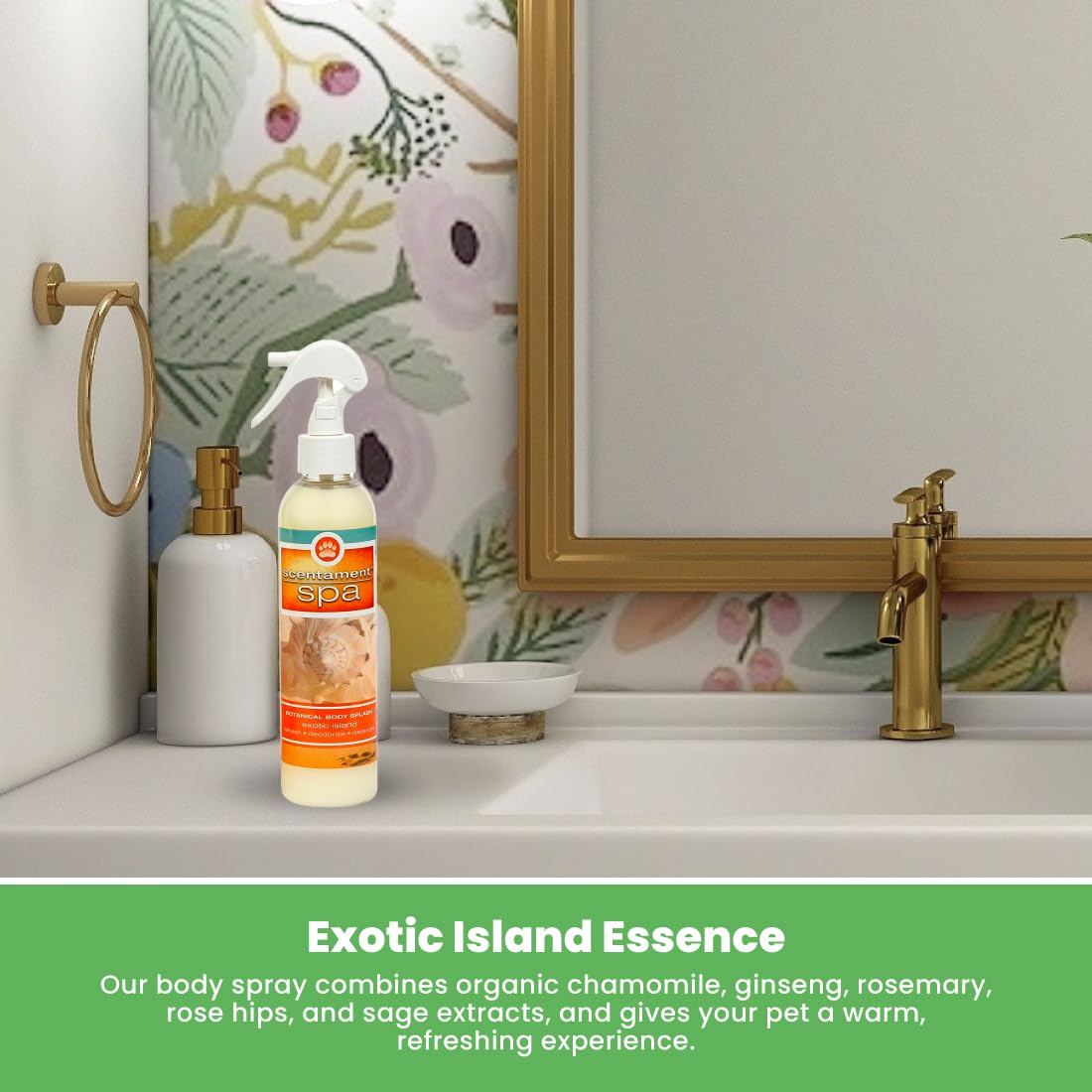 Details: Make every day a good hair day for your pet with Best Shot’s Scentament Spa body splash. Our ready-to-use body spray is infused with the irresistible Exotic Island botanical essence, along with organic chamomile, ginseng, rosemary, rose hips, and sage extracts for an aromatic fragrance in every splash. Loaded with vitamins A, D, and E, silk protein, and more, Best Shot’s body spray effectively cleans, detangles, reduces brushing and combing time, and eliminates static from your furball’s coat. Our alcohol-free and fabric-safe skincare product is cruelty-free and safe for the environment. Regular application of this aromatic cat and dog cologne spray helps reduce malodor on the pet’s body between baths. The gentle detangler spray is free from harsh and harmful chemicals and nourishes your pet’s coat. Best Shot Scentament Spa Botanical Body Splash - Exotic Island essence is available in an 8-ounce bottle and is safe for dogs, cats, puppies, and kittens (over 12 weeks old). A matching body wash and conditioner from the range is also available.
