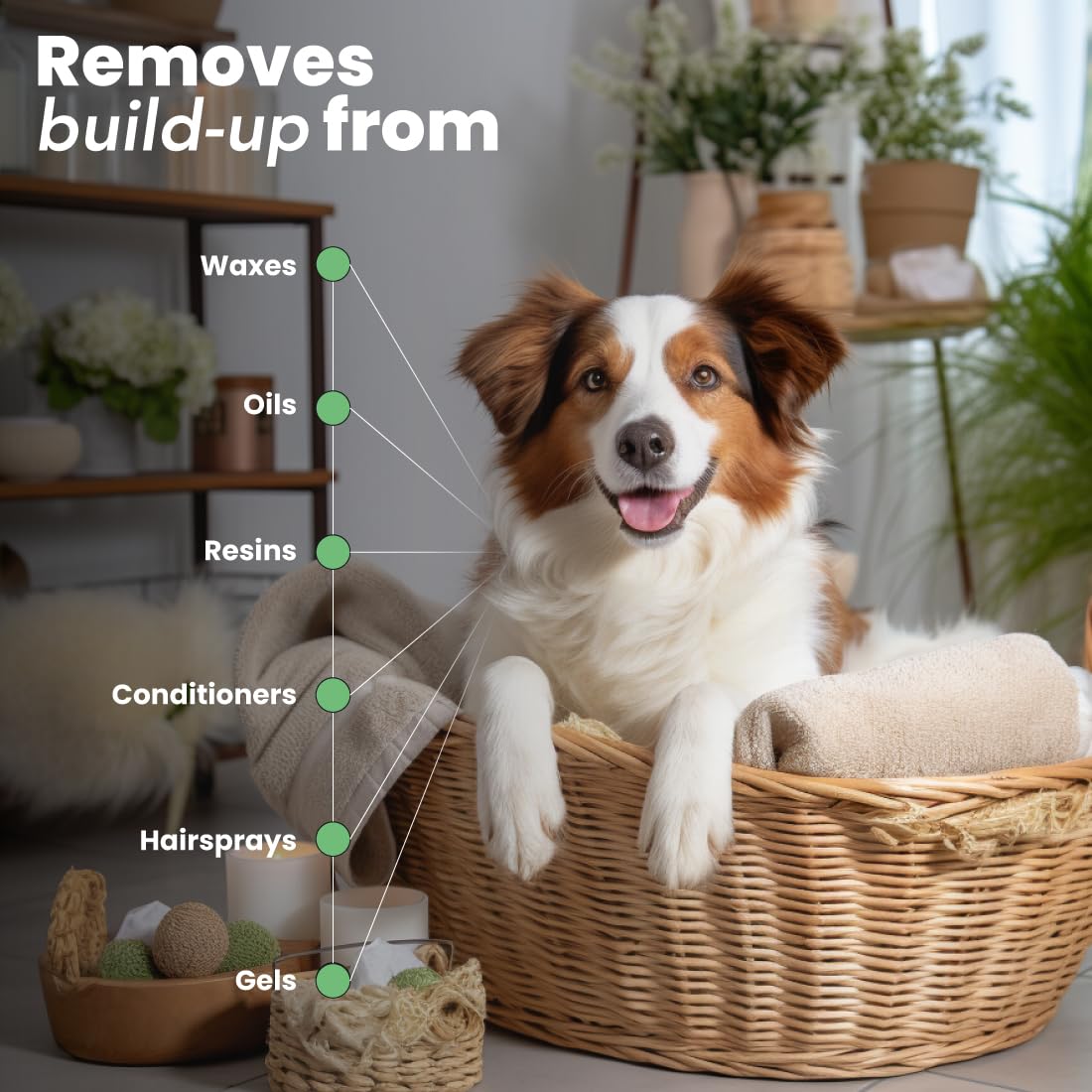 - Pet Grooming Supplies: This clarifying pet shampoo is great for removing build-up from waxes, oils, resins, conditioners, hairsprays, and gels. Consistent application effectively washes out chalks and heavy silicones.
