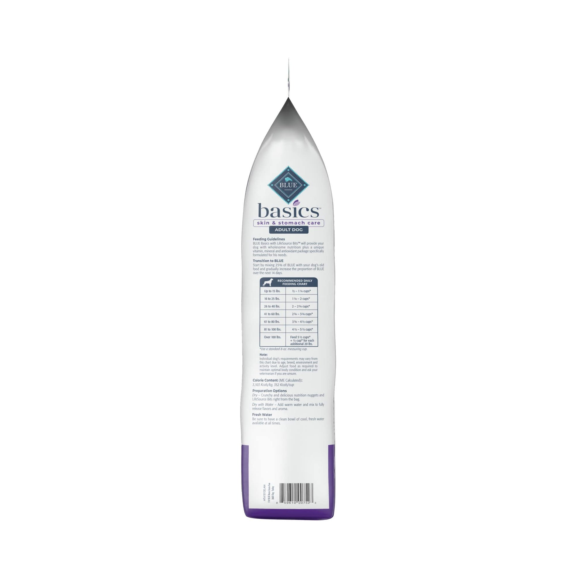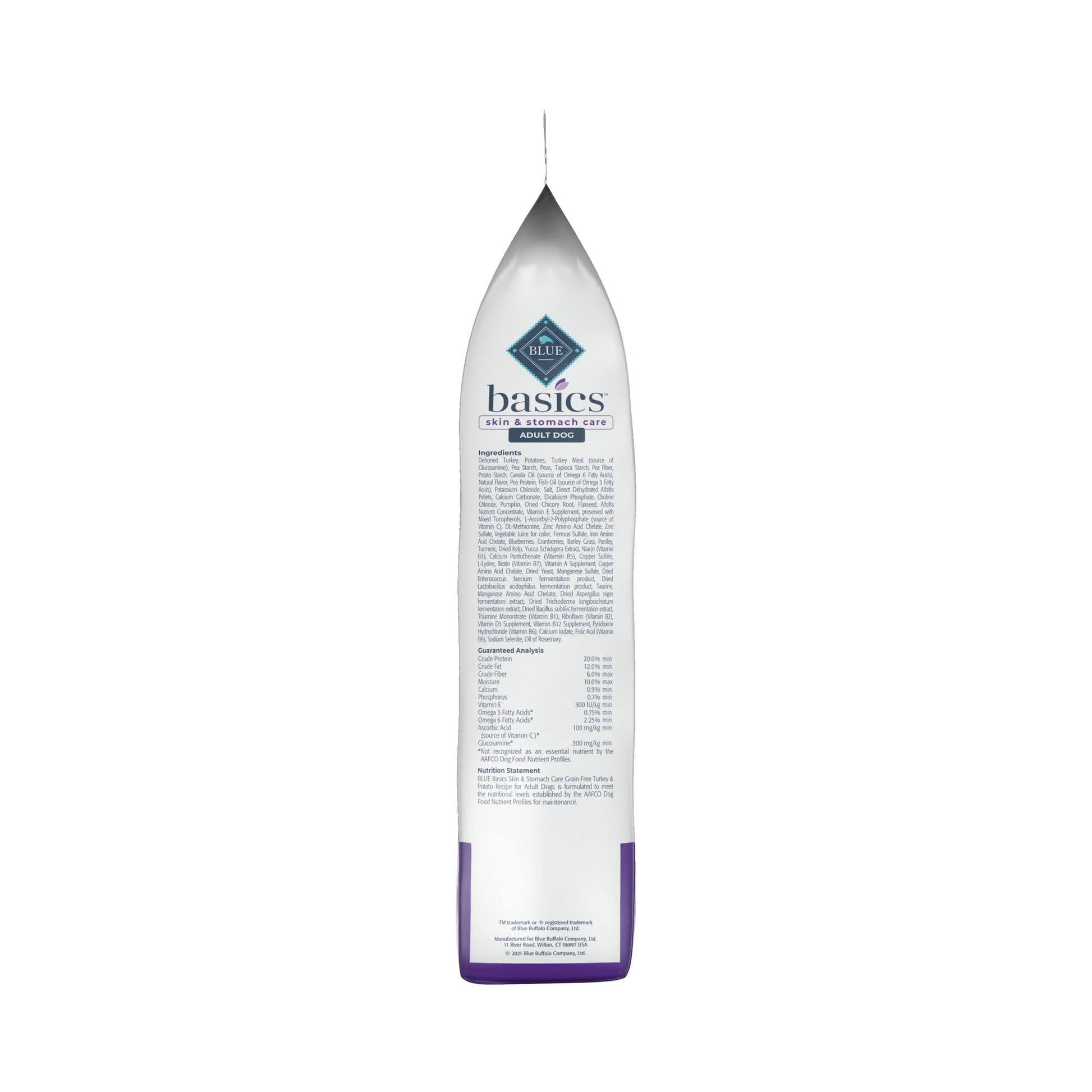 - Contains: One (1) 11-lb bag of BLUE Basics Skin & Stomach Care Adult Grain-Free Dry Dog Food, Turkey & Potato Recipe