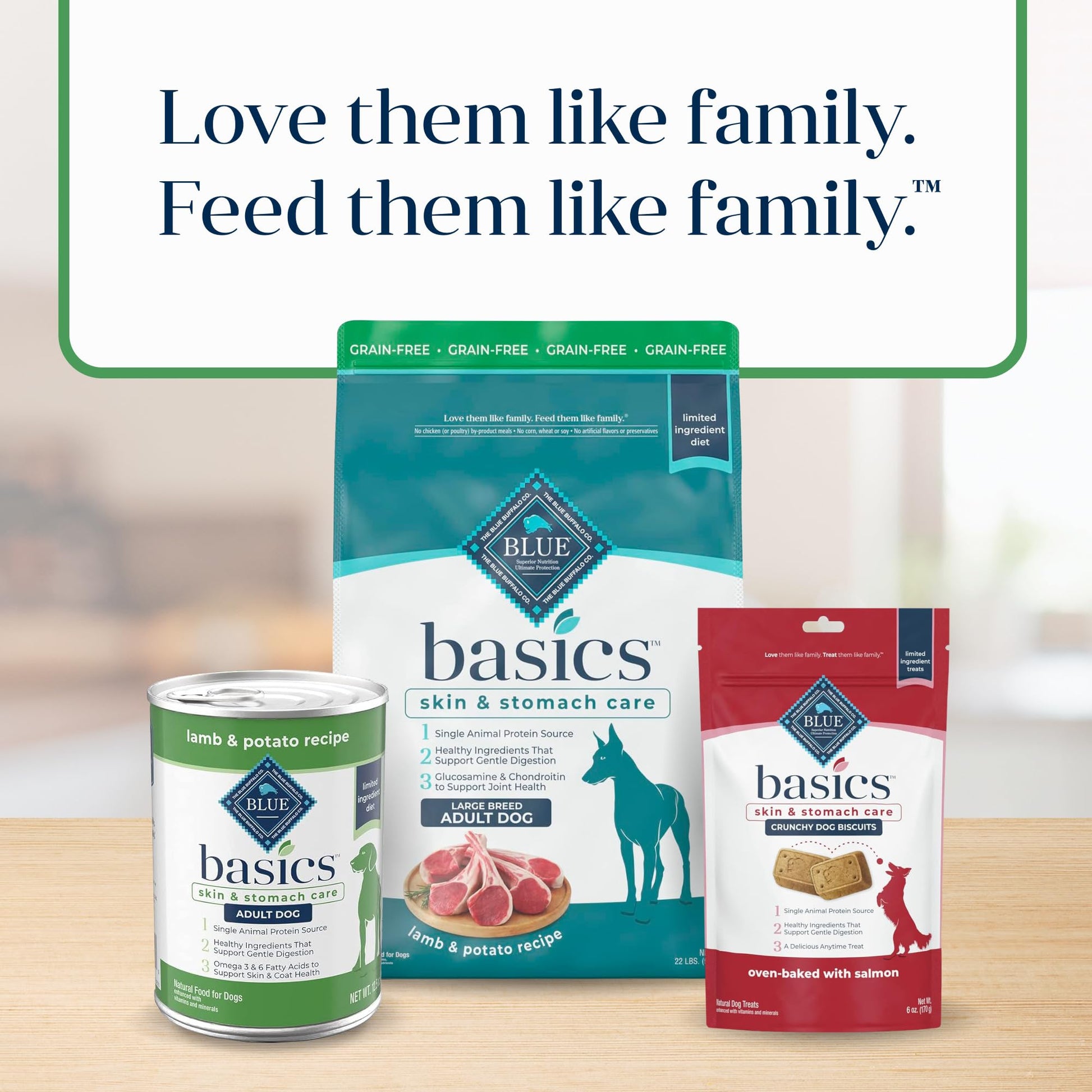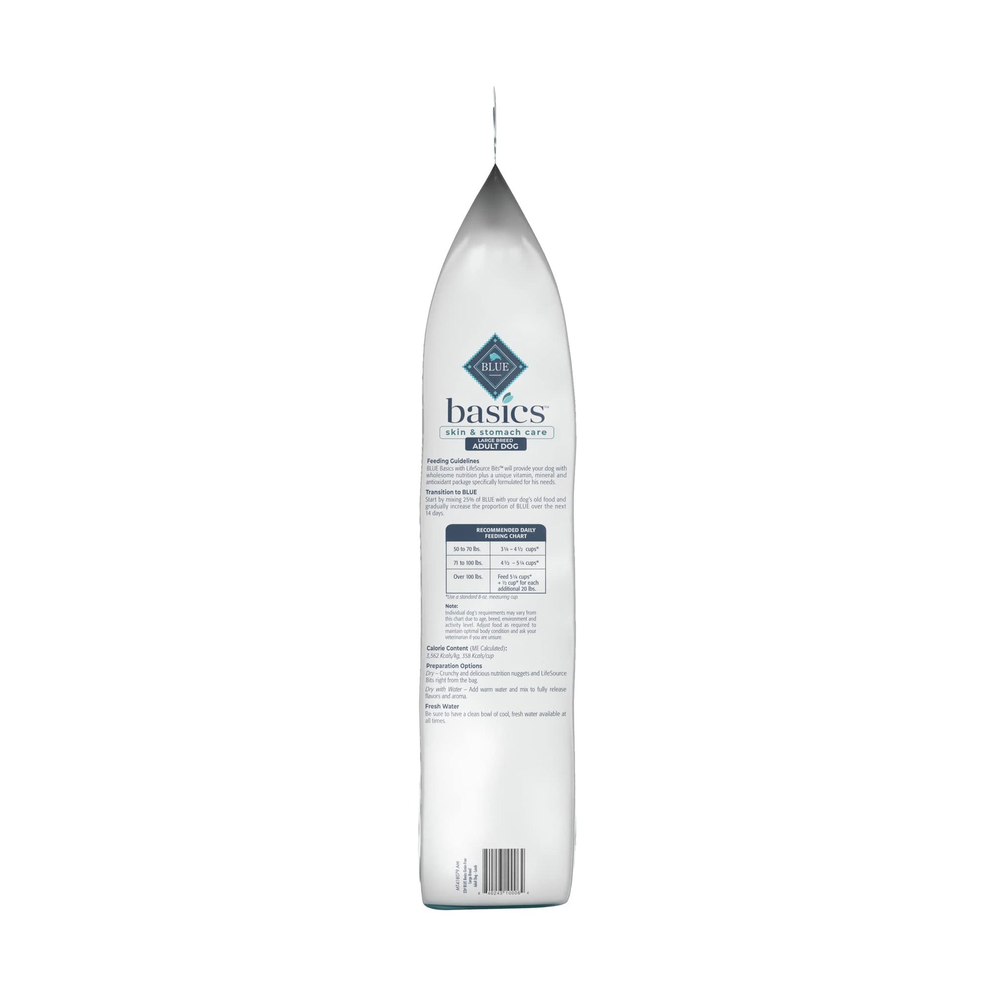 - Contains: One (1) 22-lb bag of BLUE Basics Skin & Stomach Care Adult Large Breed Grain-Free Dry Dog Food, Lamb & Potato Recipe