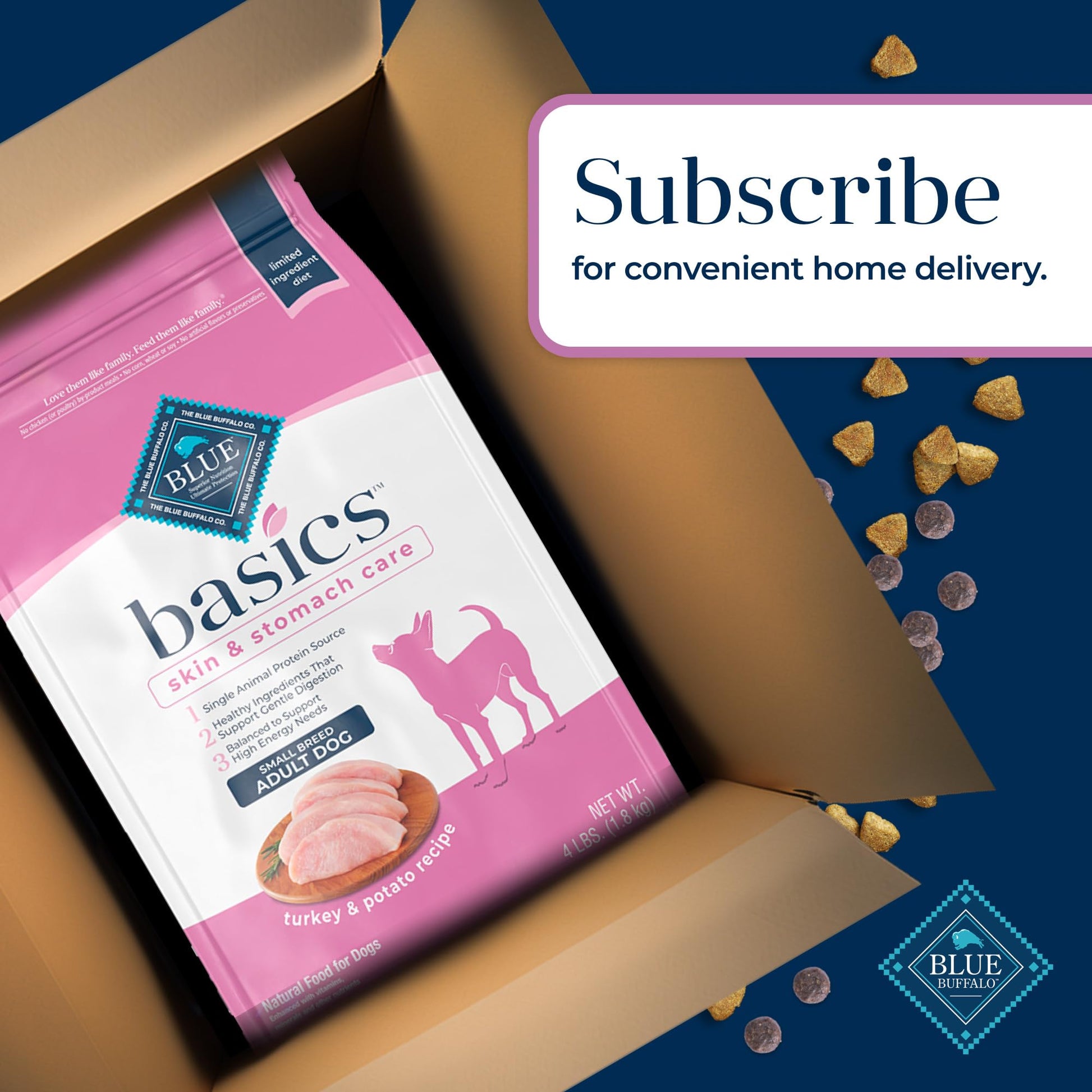 - Contains: One (1) 4-lb bag of BLUE Basics Skin & Stomach Care Adult Small Breed Dry Dog Food, Turkey & Potato Recipe