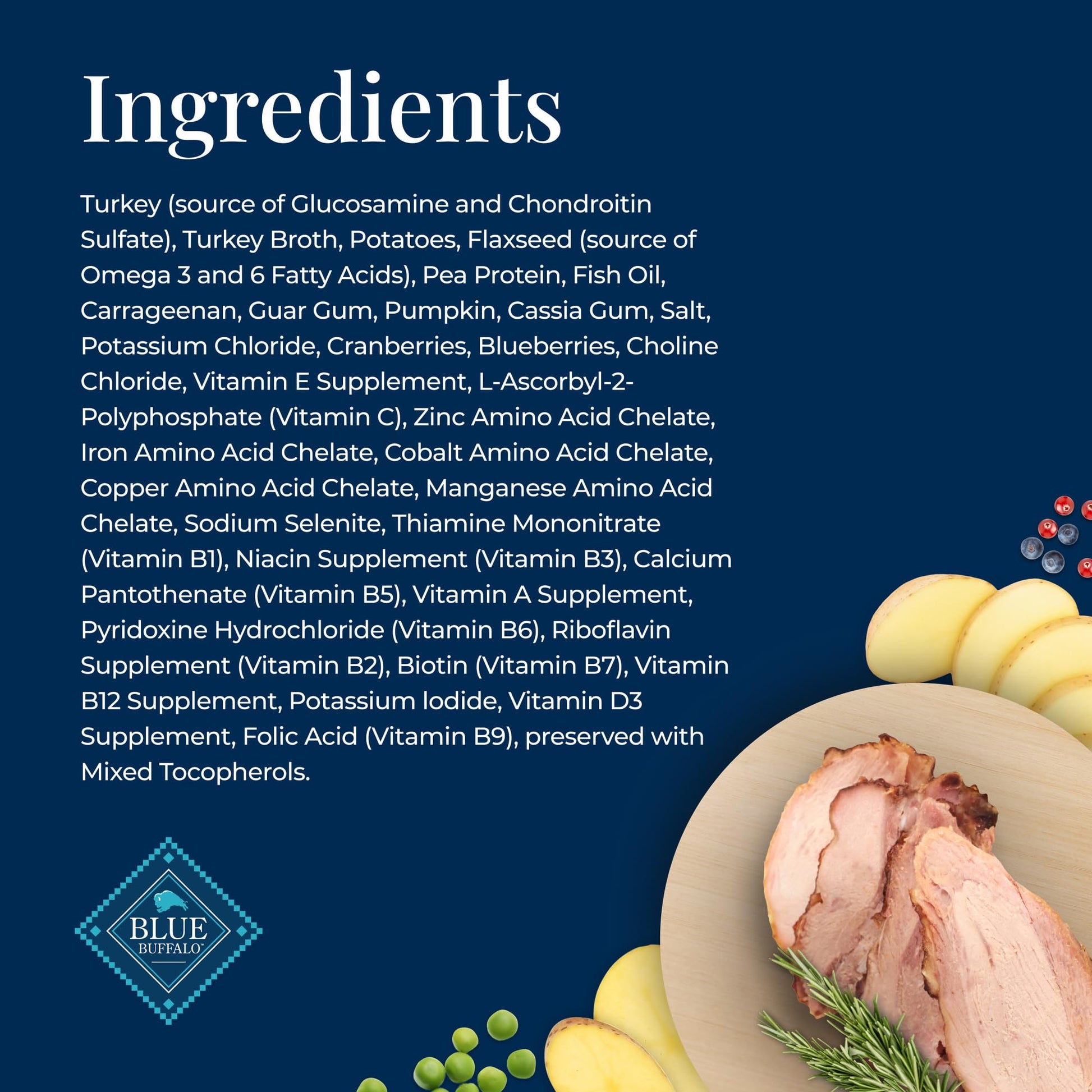 Details: Support your senior dog's skin and digestive health with Blue Buffalo Basics Grain-Free Senior Wet Dog Food, Turkey & Potato Recipe. Formulated with healthy ingredients that support gentle digestion, this limited-ingredient dog food promotes healthy skin and a shiny coat with Omega 3 & 6 fatty acids. What's more, this grain-free dog food is made with real, high-quality turkey as the first ingredient to help maintain healthy muscles, and it contains Glucosamine and Chondroitin to support joint health and mobility. And like all Blue Buffalo natural dog foods, BLUE Basics contains no chicken (or poultry) by-product meals. It's also free of corn, wheat, soy, artificial flavors, and preservatives.