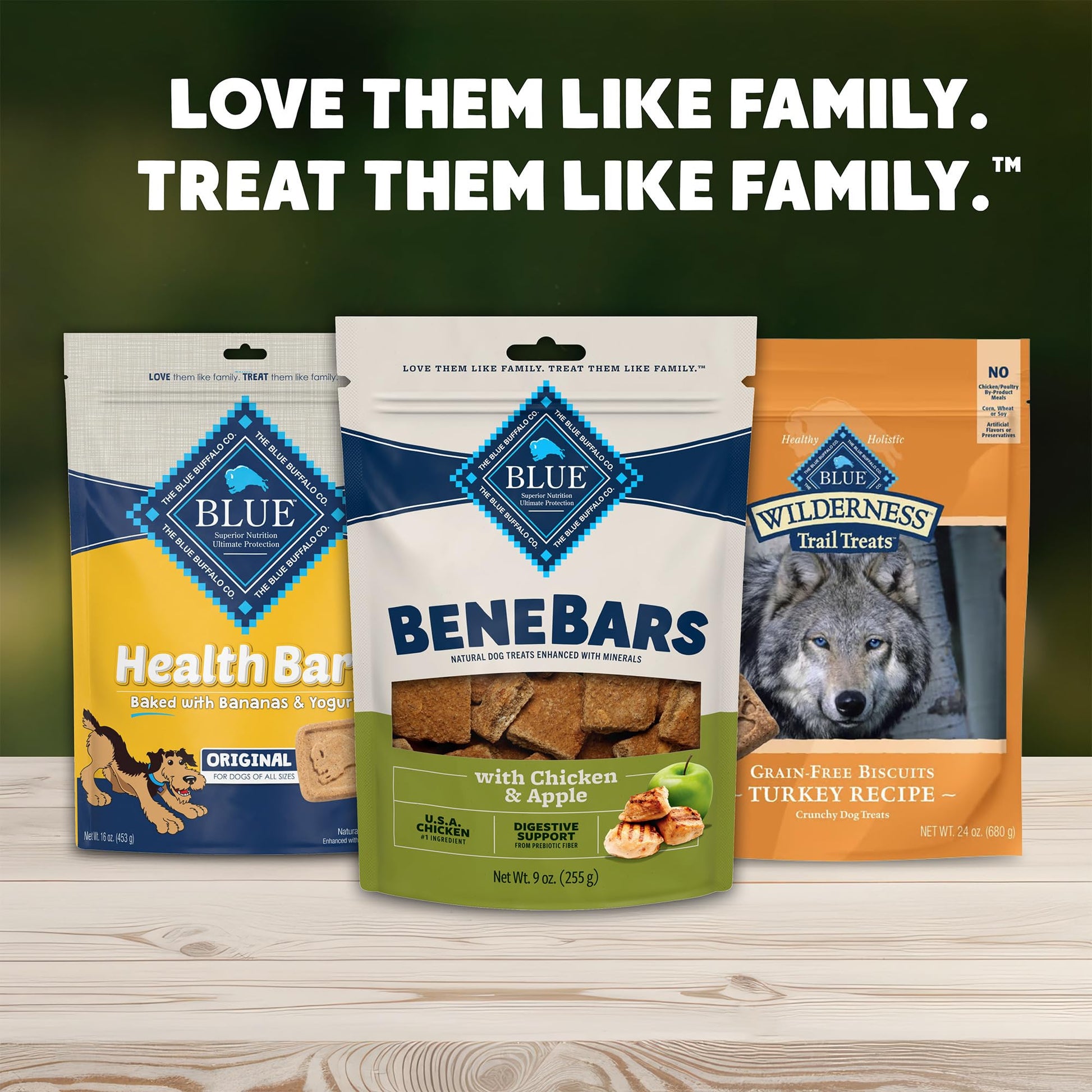 Details: Help keep your pup's digestive health on track with these BLUE BeneBars Treats for Dogs. These soft dog treats are crafted with real USA chicken and real apples. They are packed with antioxidants that create an irresistible aroma that will keep your pup coming back for more. Plus, they contain prebiotic fiber to support digestive health in dogs and contain no artificial flavors or preservatives and no corn, wheat, or soy. These Blue Buffalo treats are soft-baked, scrumptious, and packed with wholesome ingredients, perfect for pups of all breed sizes. LOVE them like family. TREAT them like family.