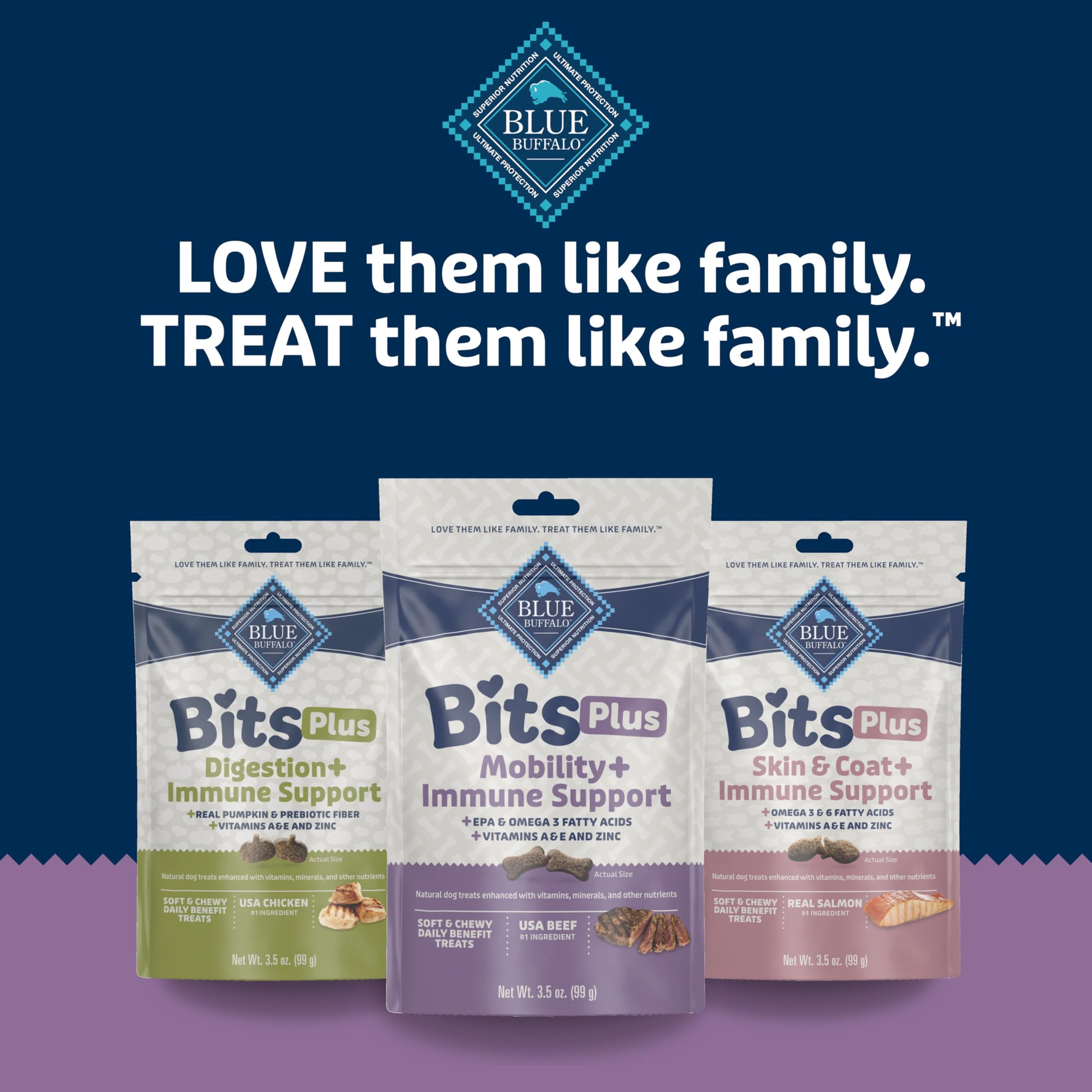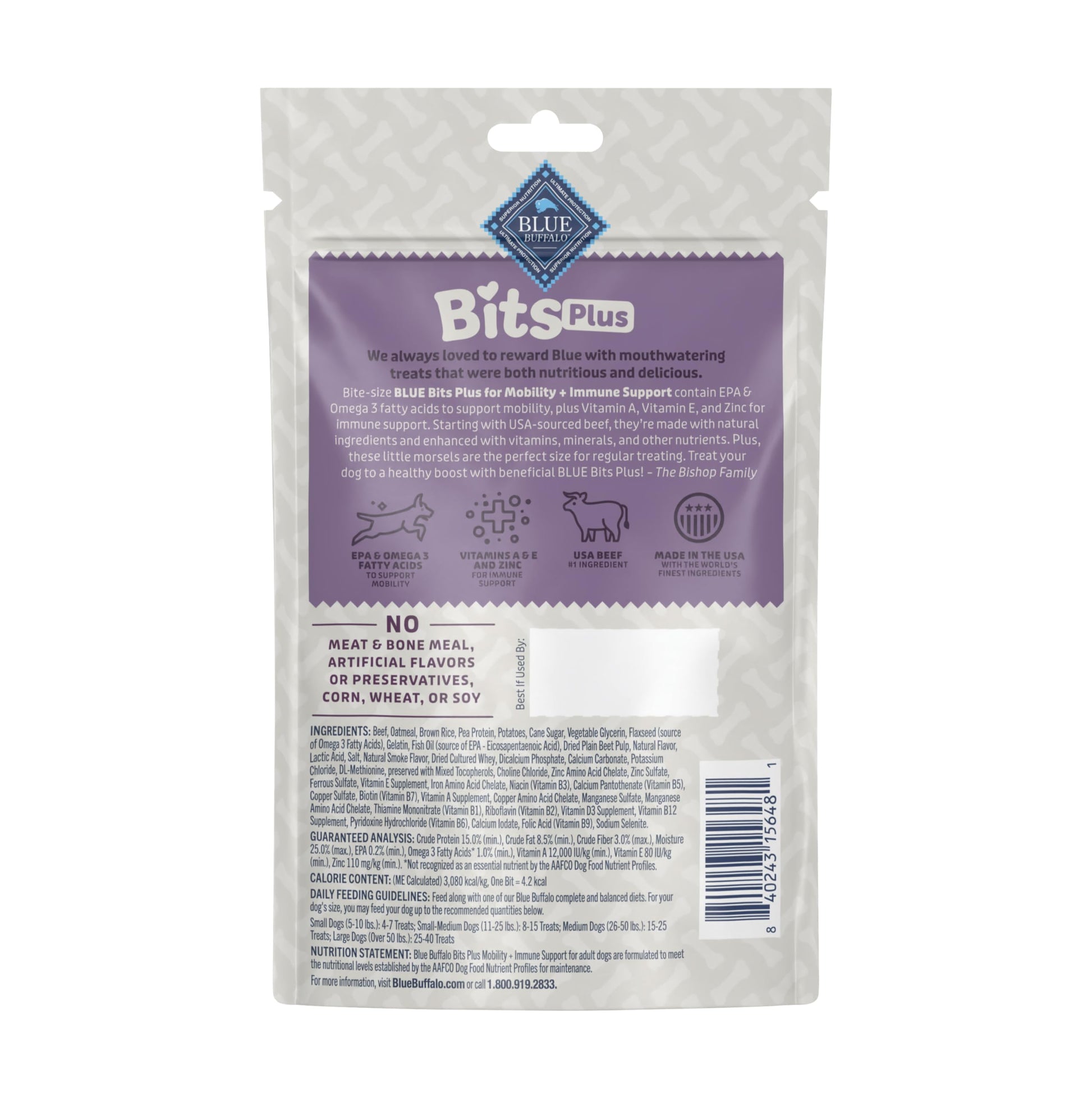 Details: Reward your dog with mouthwatering treats that are both nutritious and delicious. Bite-size BLUE Bits Plus for Mobility and Immune Support contain EPA and Omega 3 fatty acids to support mobility, plus Vitamin A, Vitamin E, and Zinc for immune support. Starting with USA-sourced real beef, BLUE Bits Plus for Mobility and Immune Support are made with natural ingredients and enhanced with vitamins, minerals, and other nutrients. They contain no meat or bone meal, no artificial flavors or preservatives, and no corn, wheat, or soy, so you can feel good about treating your best friend. Blue Bits Plus can be fed along with one of our Blue Buffalo complete and balanced diets, and these soft and chewy morsels are the perfect size for regular treating. Treat your dog to a healthy boost with beneficial BLUE Bits Plus! BLUE Bits Plus are brought to you by Blue Buffalo, the leader in natural pet food. LOVE them like family. TREAT them like family."