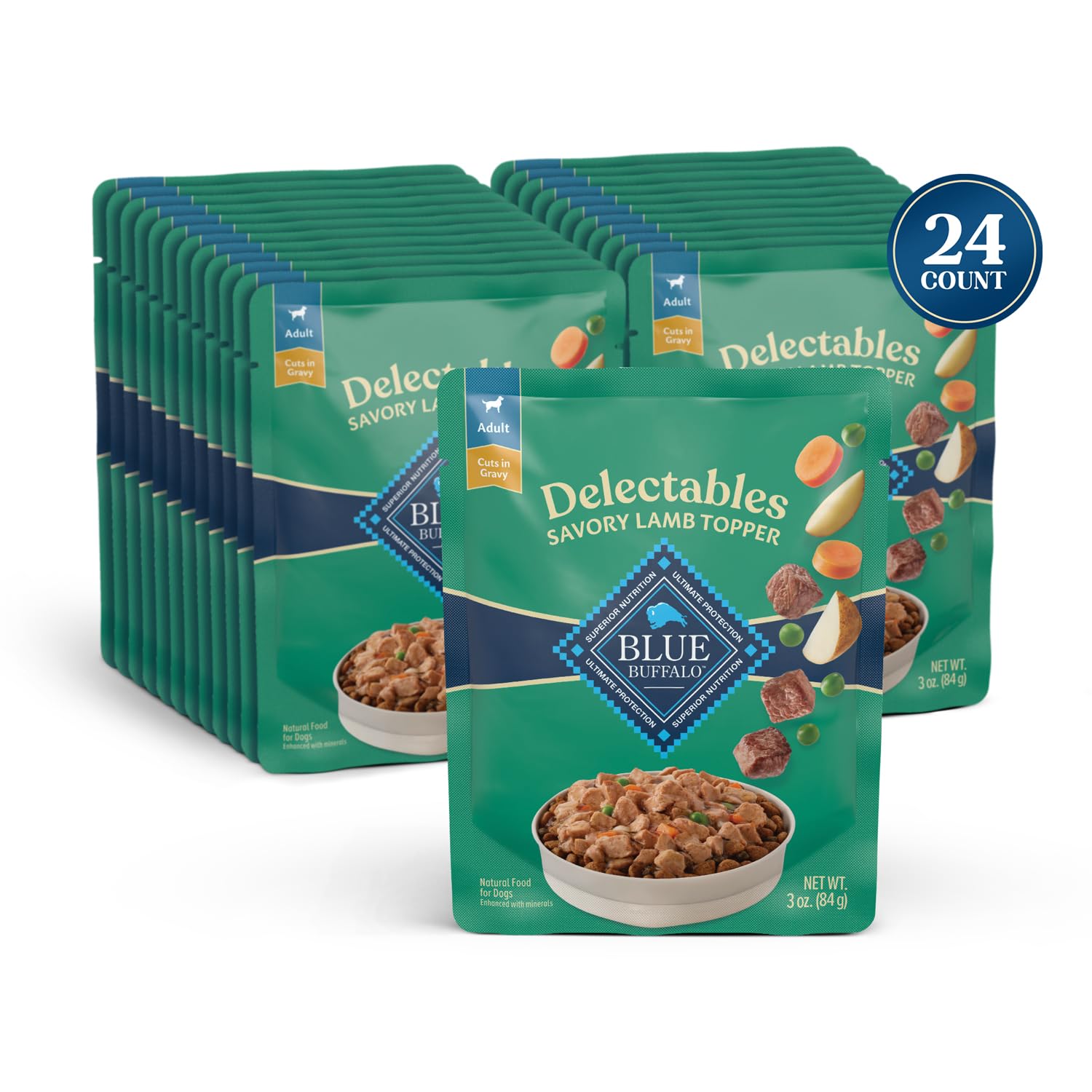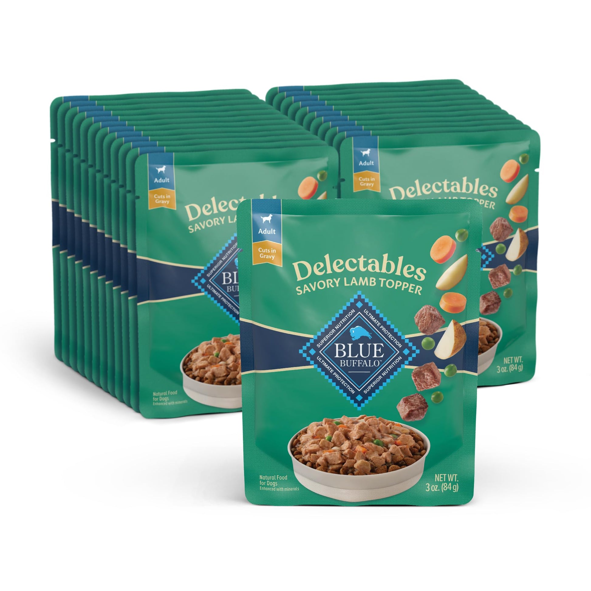 Details: For the dog that deserves the very best, there’s BLUE Delectables Savory Lamb Topper. This deliciously natural recipe is made with tender bits of real lamb mixed with garden vegetables in a savory gravy, so your dog can enjoy the homestyle flavors they love. Use BLUE Delectables as a topper for your dog’s favorite Blue Buffalo dry food to make mealtime extra special — or serve it as a standalone treat to reward good behavior. BLUE Delectables recipes are enhanced with minerals and always start with real meat and contain no poultry by-product meals, no corn, wheat, or soy, and no artificial flavors or preservatives. BLUE Delectables Savory Lamb Topper is intended for intermittent or supplemental feeding only and should be fed along with a complete and balanced diet. BLUE Delectables is brought to you by Blue Buffalo, the leader in natural pet food. Love them like family. Feed them like family.