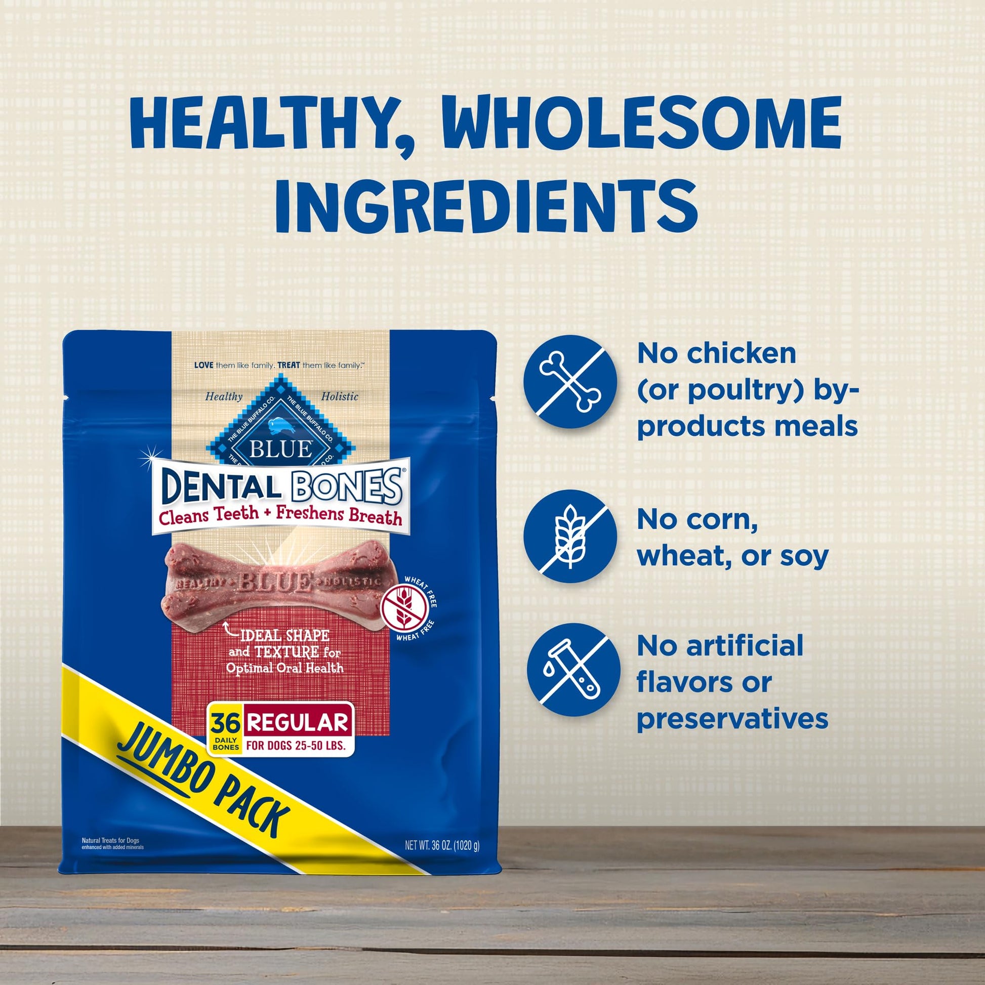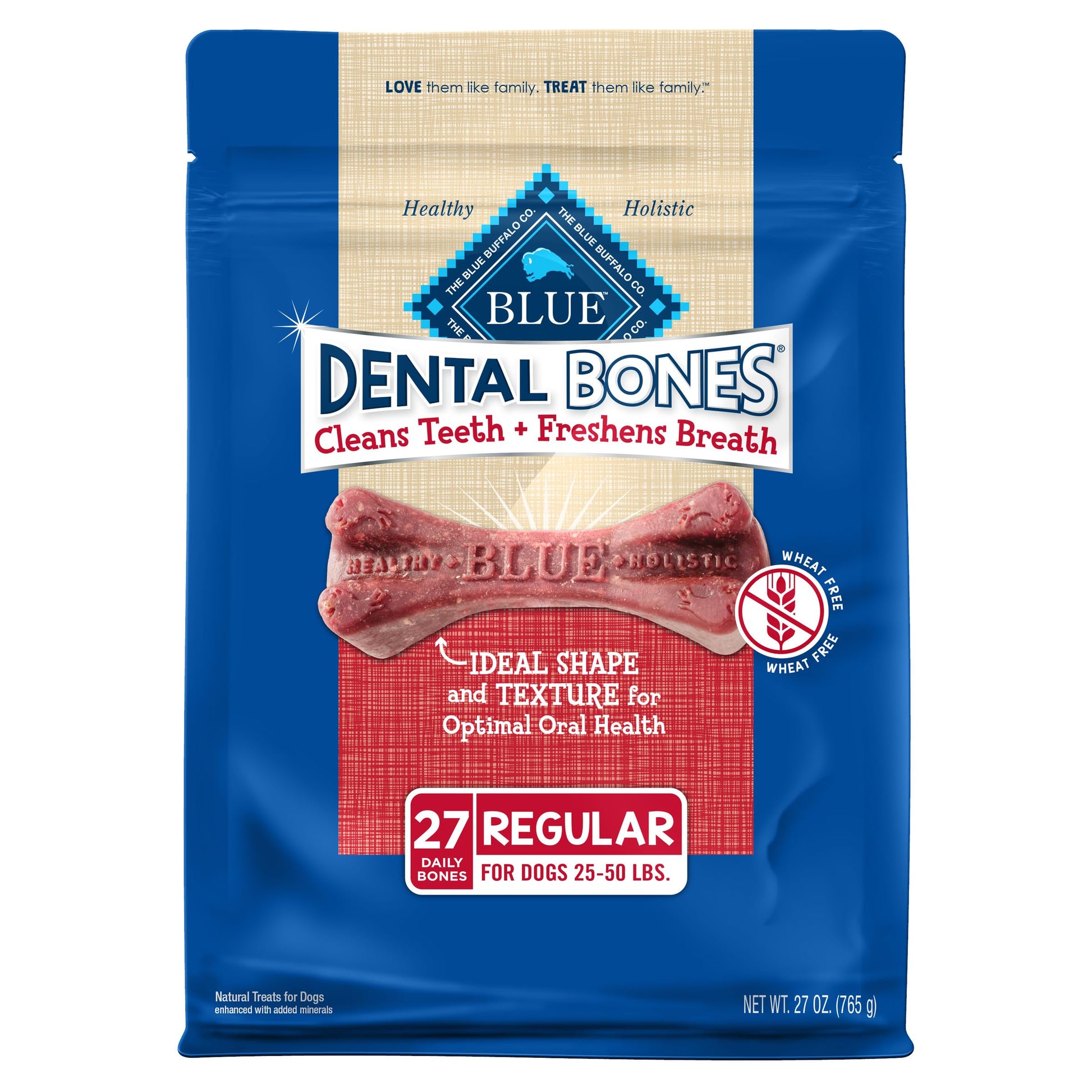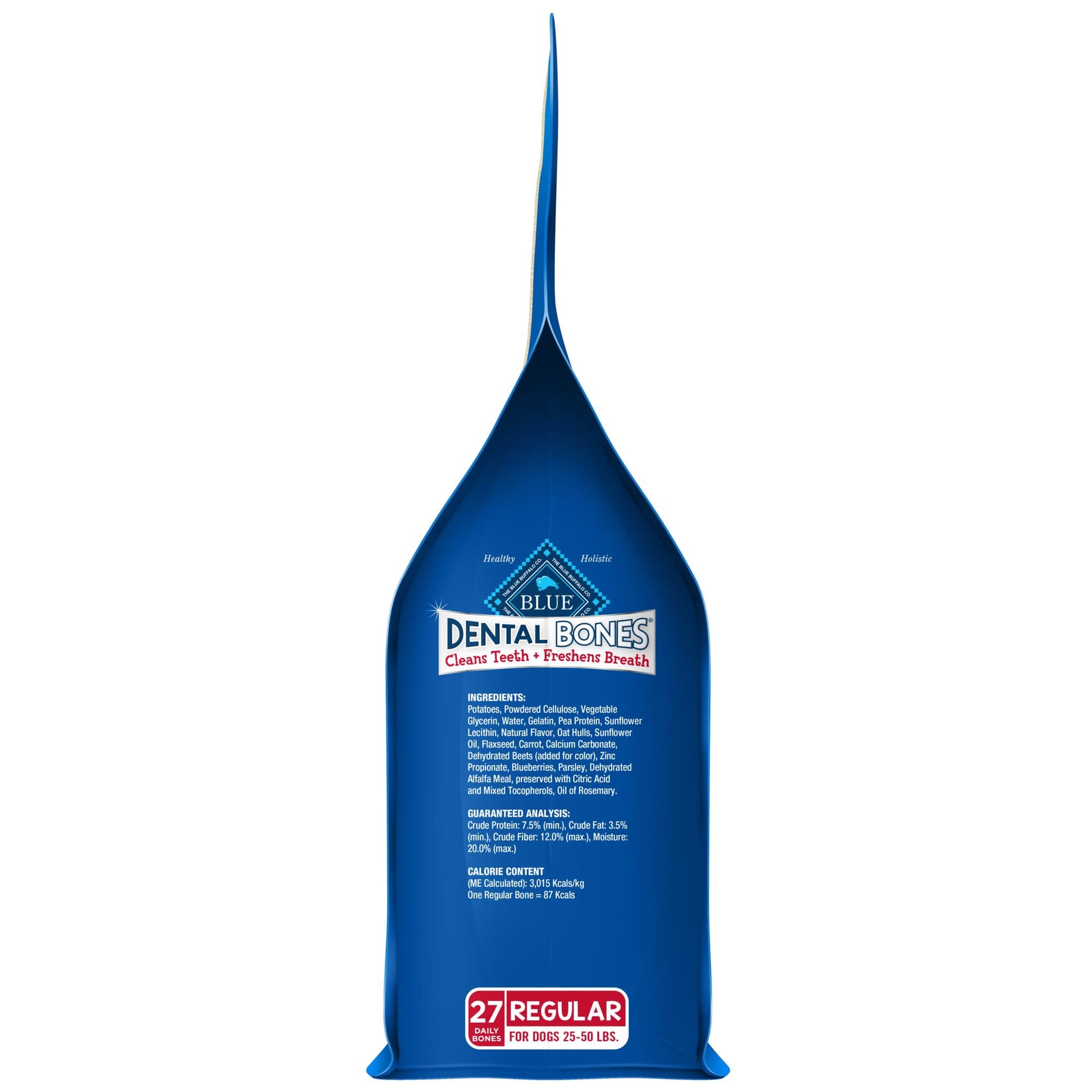 - Contains one 27-oz Value Pack bag of BLUE Dental Bones Natural Adult Dental Chew Dog Treat, Regular
