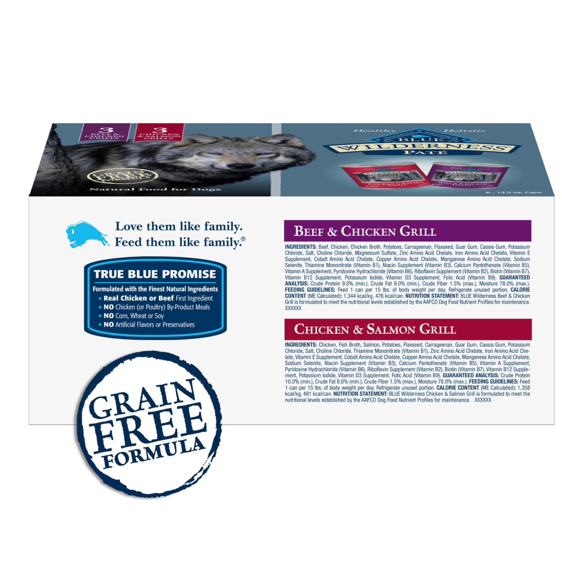 - PACKAGING MAY VARY: Contains One (1) variety pack of Blue Buffalo Wilderness High Protein Grain Free, Natural Adult Wet Dog Food, Beef & Chicken Grill and Chicken & Salmon Grill 12.5-oz cans (6 count- 3 of each flavor)