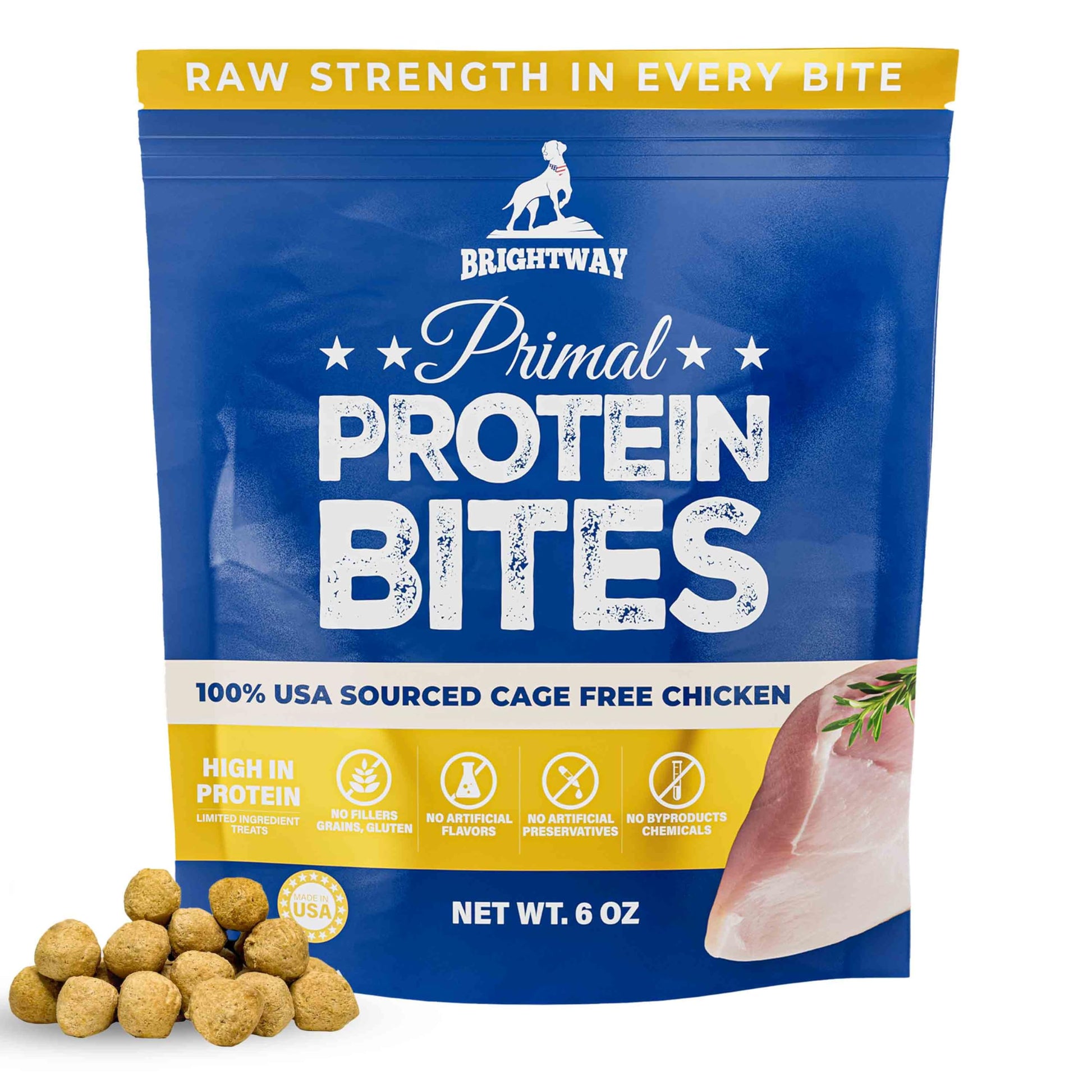 - ✅ Protein-Packed Freeze-Dried Raw Chicken Dog Treats Brightway Pets Primal Protein Bites are made with freeze-dried, premium cut chicken and chicken liver for a raw, natural treat your dog will crave. Each bite is high in protein and bursting with flavor. Iideal for supporting energy, muscle tone, and overall vitality.