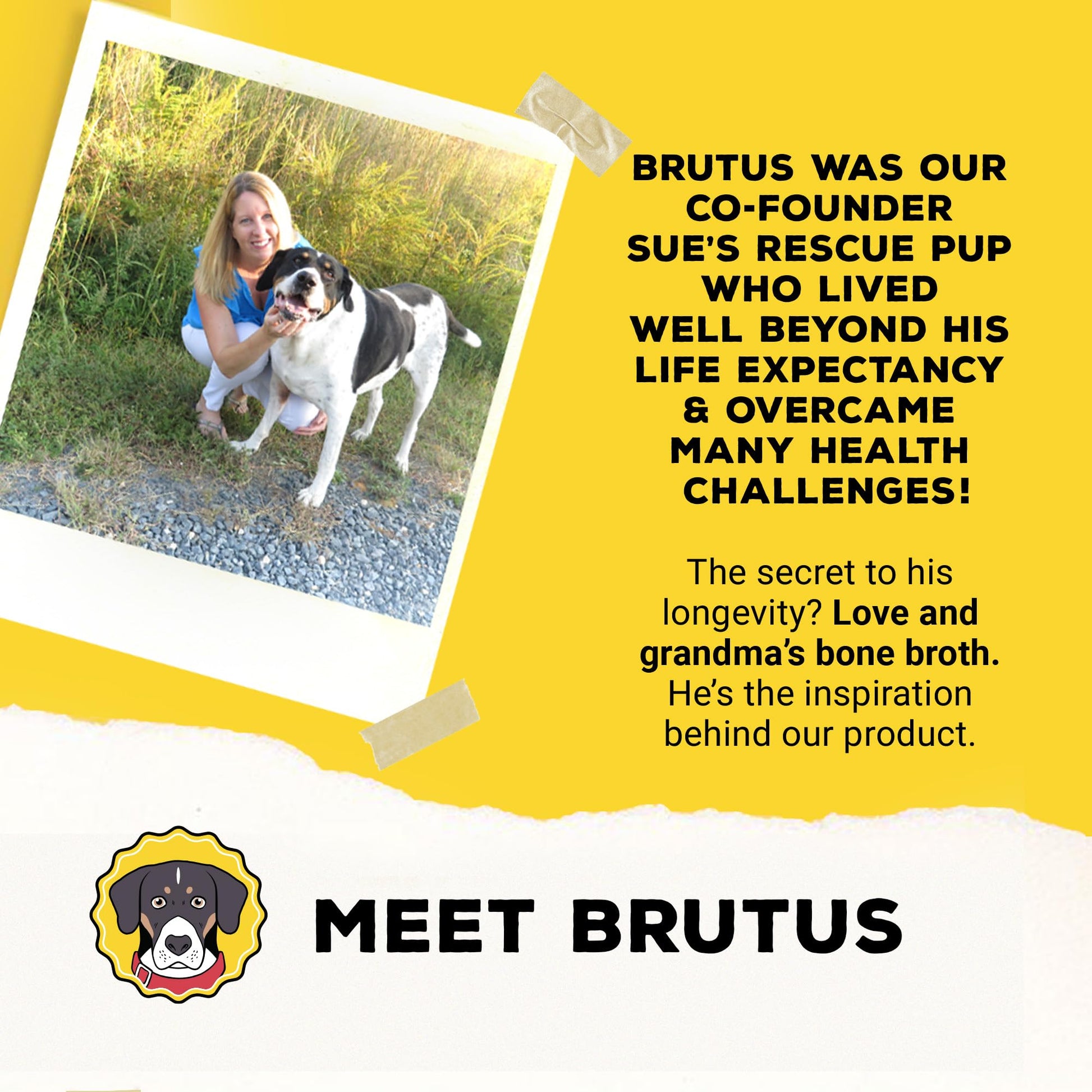 - The same bone broth taste your dog has come to know and love—now in a convenient powder form! Brutus Broth’s all natural bone broth powder for dogs provides your dog with the vital nutrients and canine specific probiotics they need while giving them a great tasting pork flavor they’ll crave