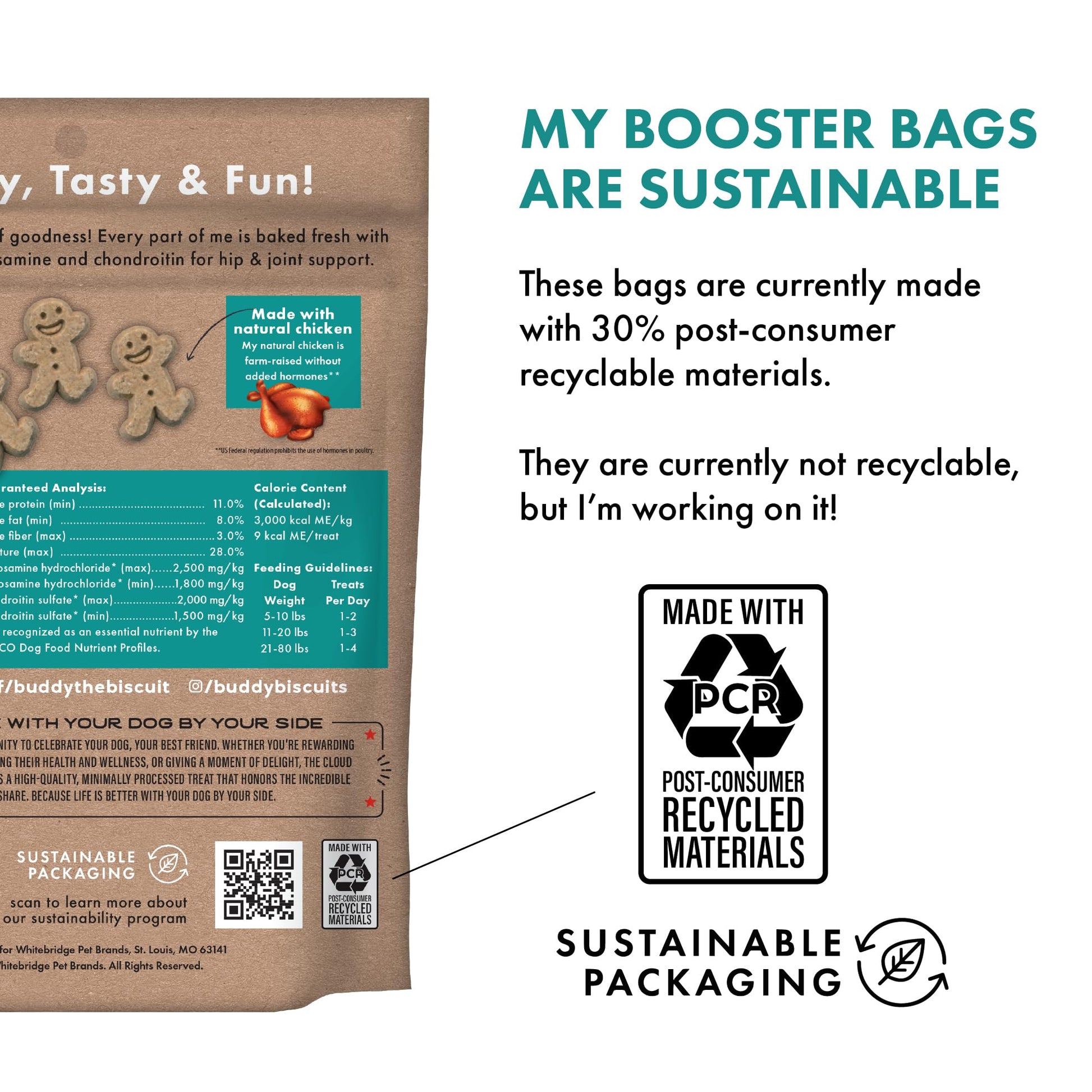 Details: Buddy Boosters™ Hip & Joint Chews with Chicken have a boost of glucosamine and chondroitin to support healthy mobility. Baked fresh in cute gingerkid shapes with just a few simple and natural ingredients, these highly palatable chews are perfect for getting supplements into your dog's diet.