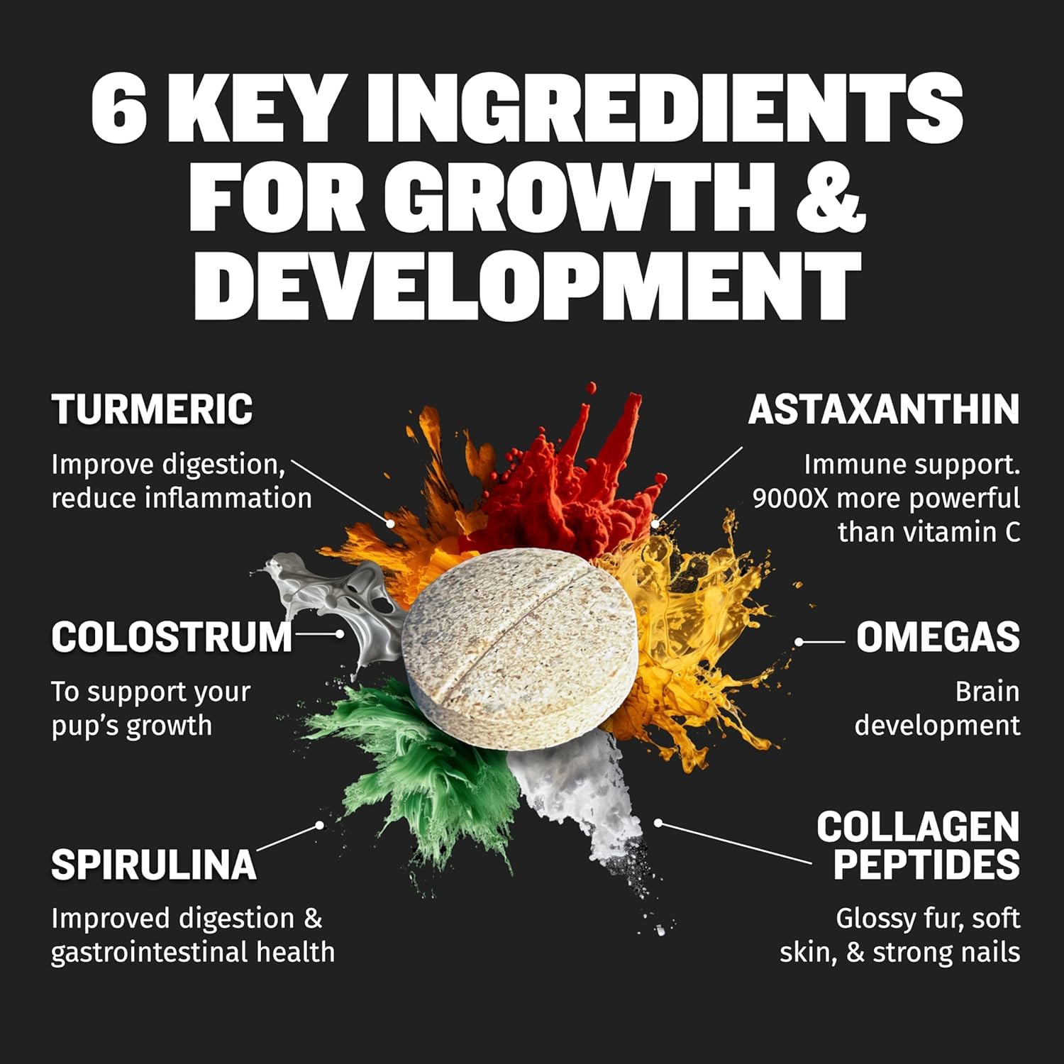- COGNITIVE, METABOLIC, AND IMMUNITY SUPPORT: Our multivitamin puppy essentials, enriched with choline and omega-3 fatty acids from fish oil, support brain health, metabolism, and immune strength. Fortified with colostrum, it enhances your puppy’s natural defenses. This powerful blend, combined with collagen peptides for joint, skin, and coat health and spirulina for proteins and antioxidants, fosters comprehensive well-being and immunity in your growing furry companion.