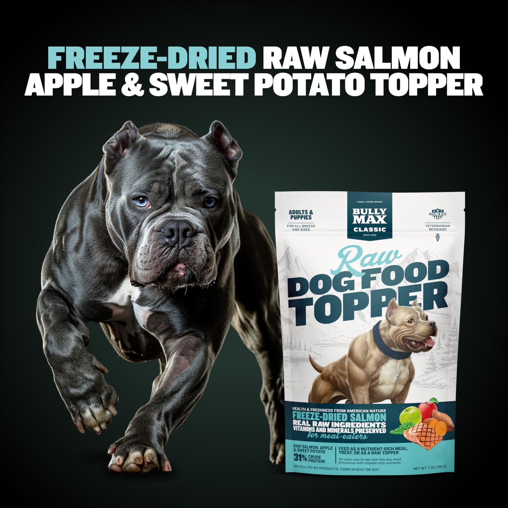 - HEALTHY WEIGHT GAIN & IMMUNE SUPPORT: Bully Max's Raw Dog Food Toppers are expertly formulated to prioritize healthy weight gain with Raw Salmon as the main ingredient. Boasting a robust 31% crude protein, these freeze-dried toppers blend real meat with chicken, apple and sweet potato for a comprehensive nutrition profile. Ideal for both small and large breeds, this meal enhancer supports immune health, digestive wellness and weight gain, catering to dogs at every stage of life.