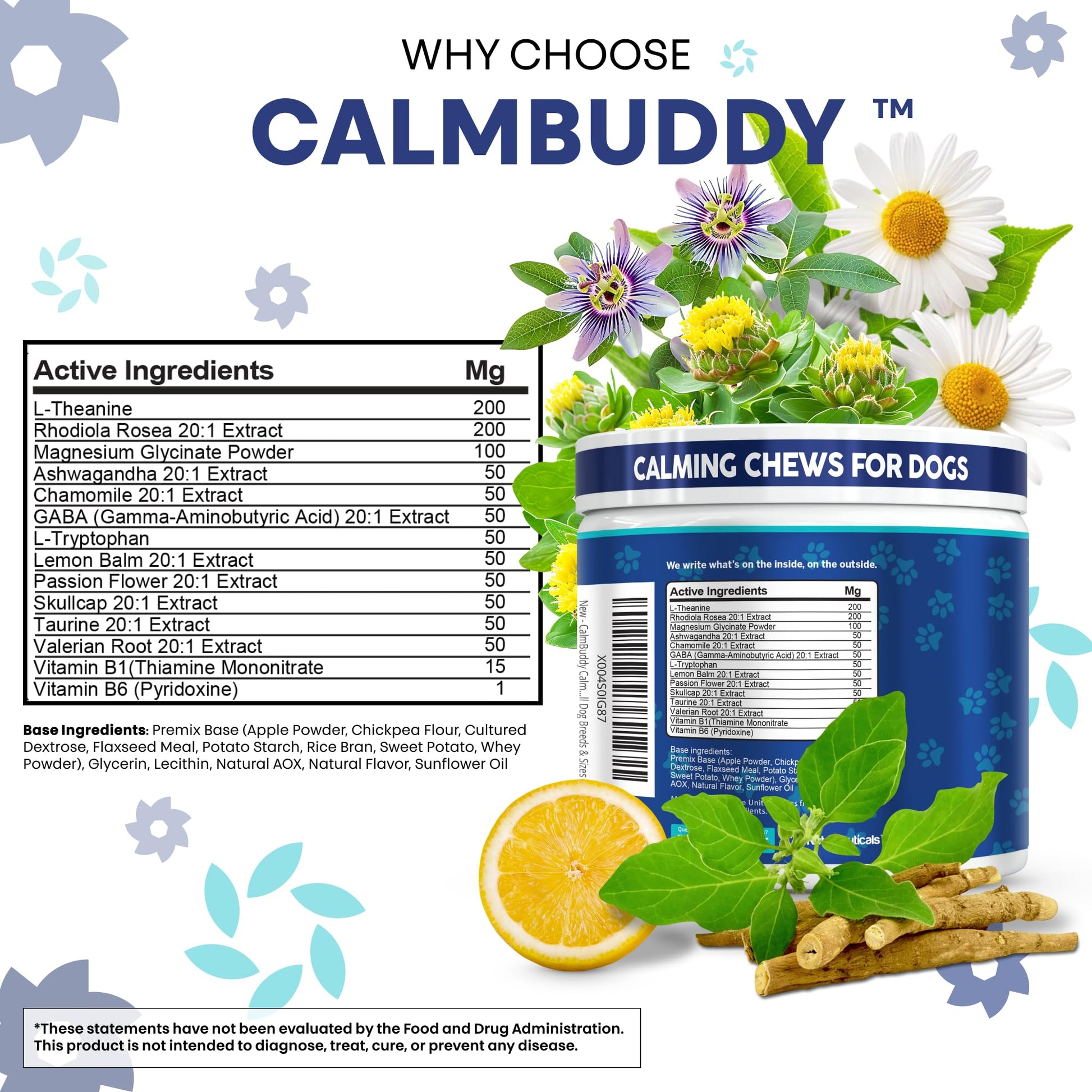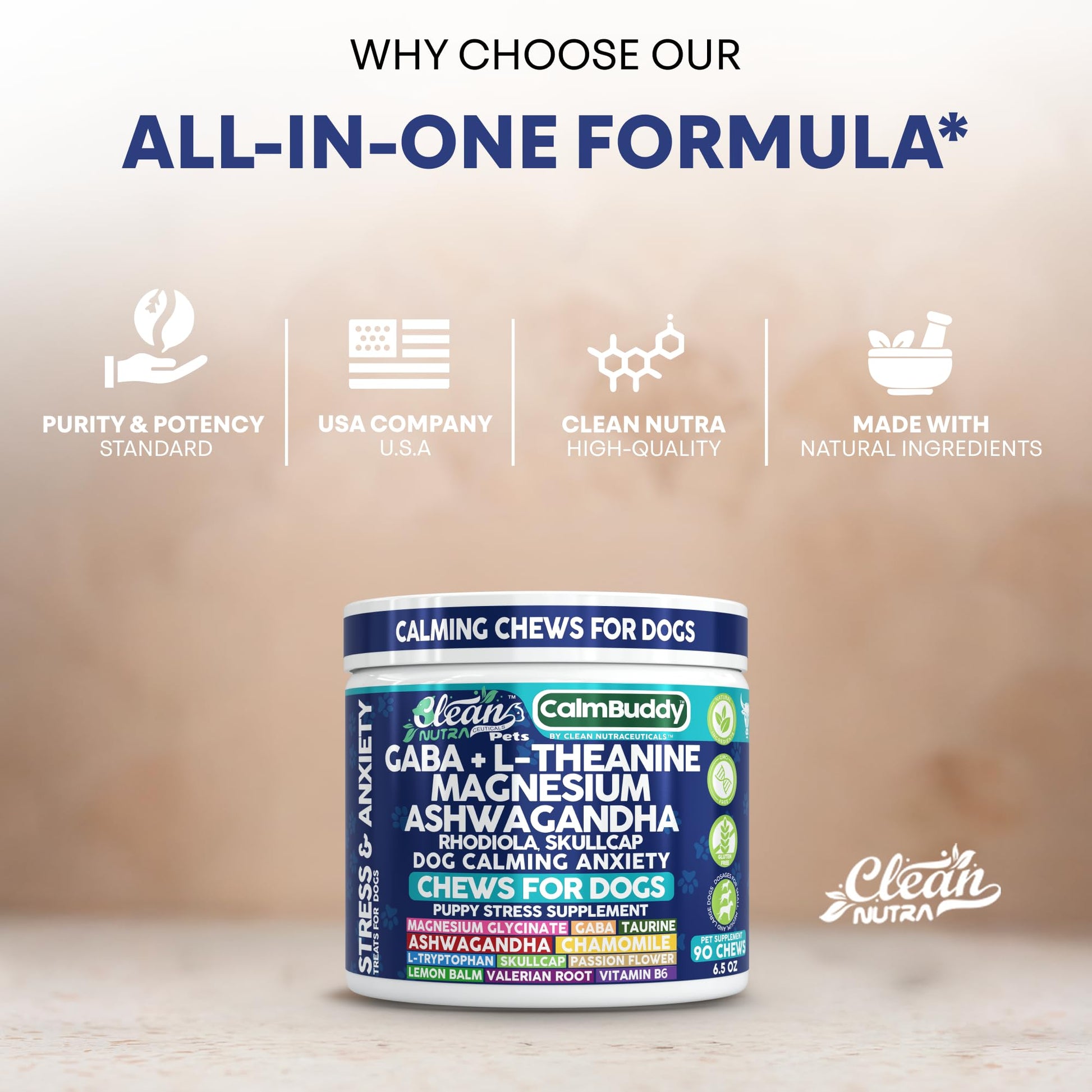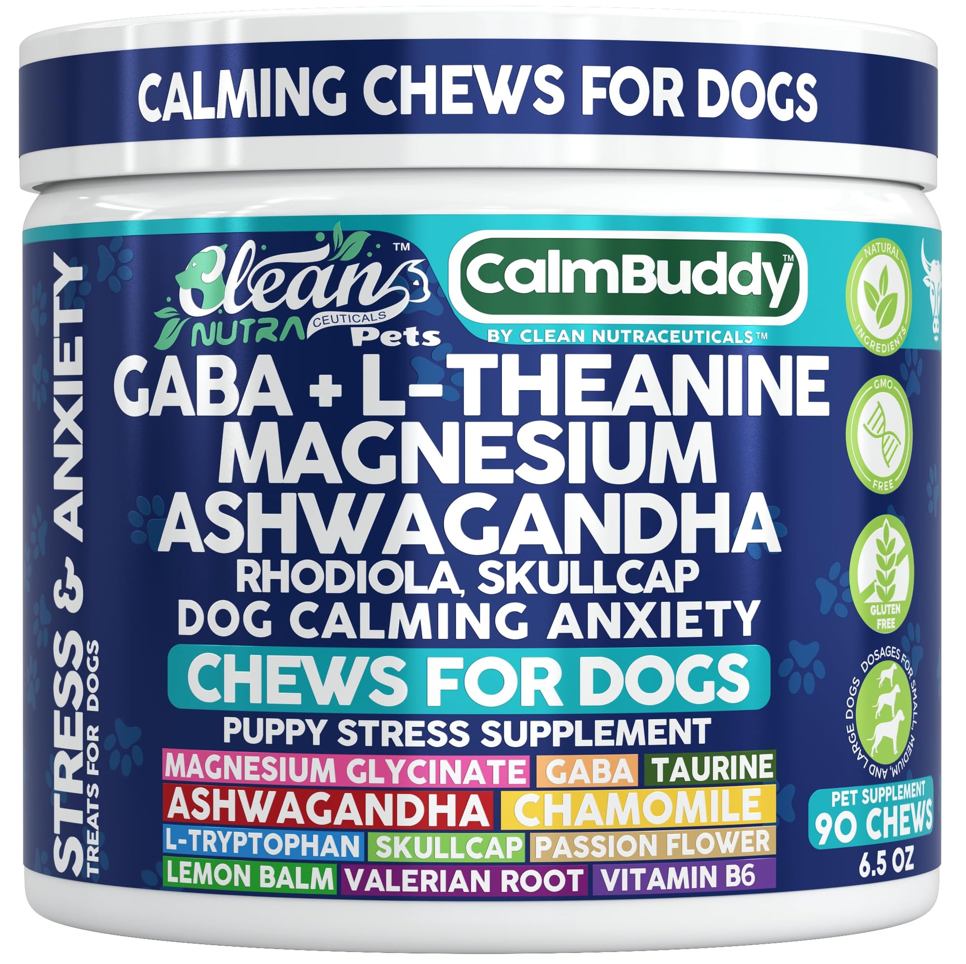 - Advanced Pet Supplement with GABA, L-Theanine & Magnesium. Clean Nutra CalmBuddy chews are specially formulated with key ingredients like GABA, L-Theanine, and Magnesium to support a complete, high-quality dog supplement experience for your canine companion.