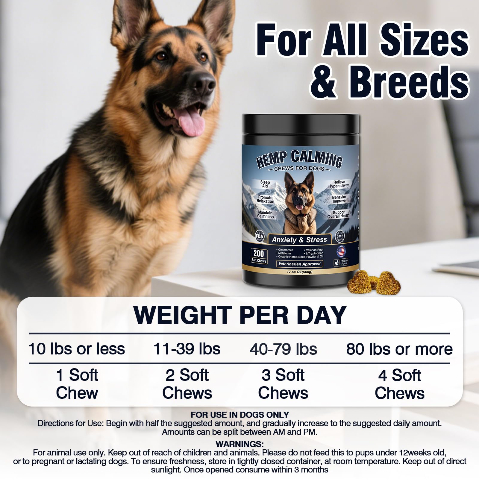 - Delicious and Cost-Effective Dogs Calming Chews: Combining irresistible chicken flavor with exceptional value, calming treats for dogs make dog anxiety relief an enjoyable experience. With 200 hemp calming chews per pack, they are suitable for dogs of all sizes and allow flexible dosages of calming dog treats based on pet’s needs. Calming chews for dogs vet approved turn anxiety relief for dogs into a treat dogs love, offering an economical and effective way to keep furry friend calm and happy