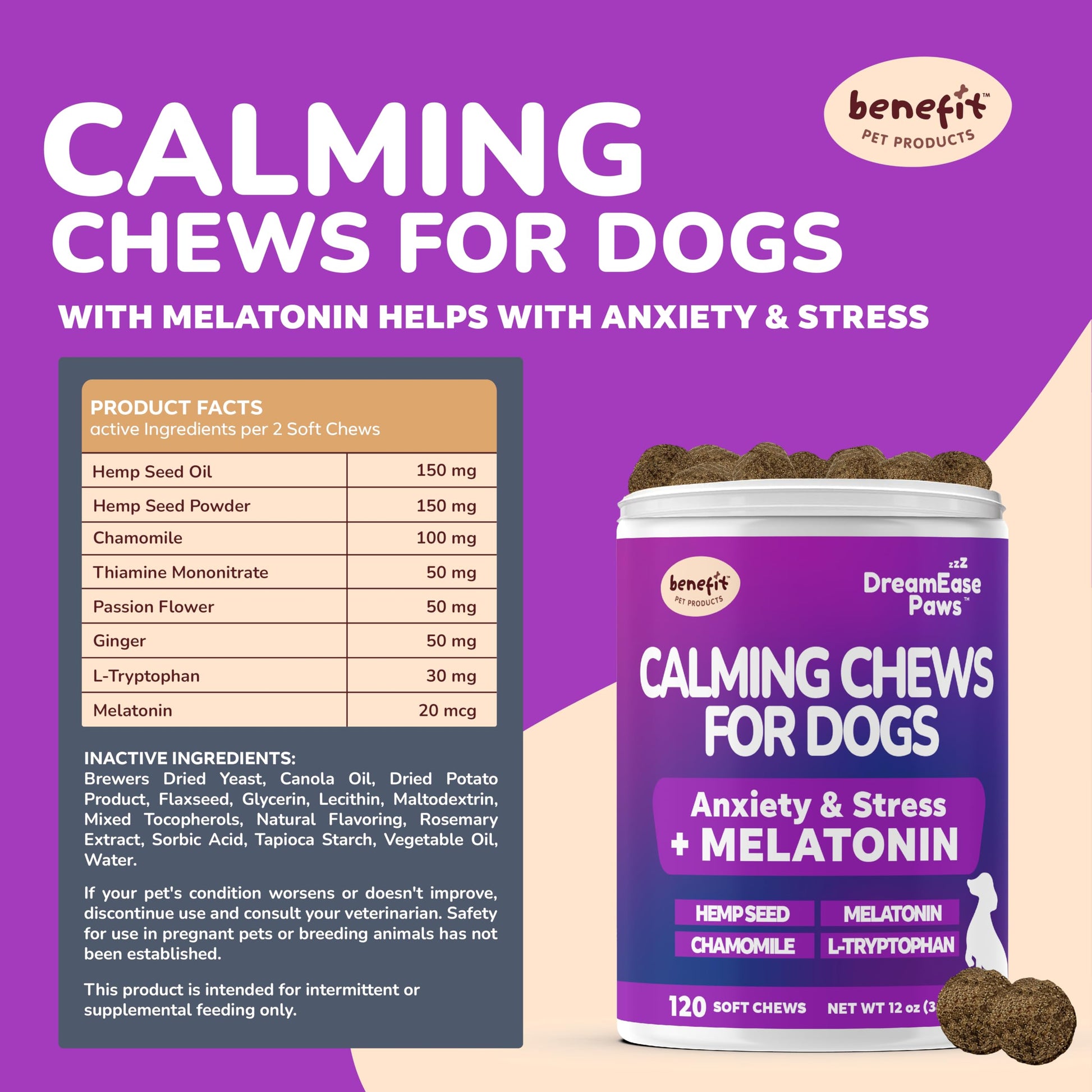 - Pet Supplements for Anxiety - Formulated with hemp, melatonin, L-Tryptophan, and chamomile, our calming treats provide effective stress and anxiety relief for dogs of all breeds and sizes. Melatonin for dogs helps regulate sleep patterns, reduce anxiety, and promote relaxation. These pet supplements for anxiety work naturally to soothe your pet's nerves.