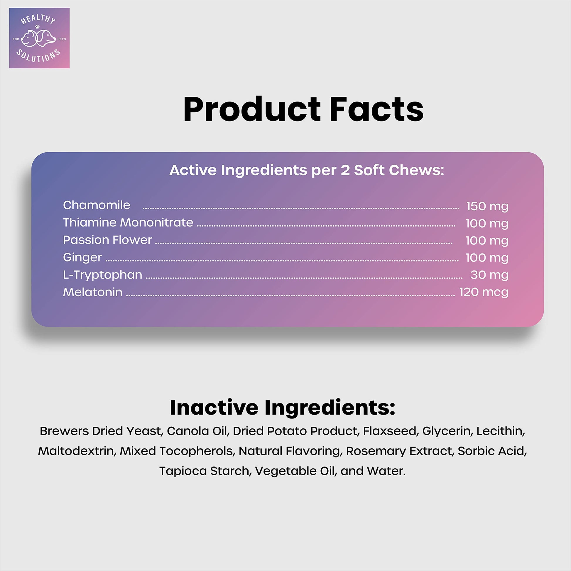 Details: 🗸 CALMING CHEWS THAT TASTES LIKE A TREAT -- Veterinarian recommended to help reduce stress and tension while promoting rest and relaxation. 🗸 VETERINARIAN FORMULATED -- with Melatonin, Chamomile, Passion Flower, Thiamine, L-Tryptophan, and Ginger to help soothe sensitive stomaches. 🗸 FOR ALL CAUSES OF ANXIETY -- Now pet parents can rest easy knowing their pup is resting easy. Recommended to help with crate training, loud noises, thunderstorms, fireworks, grooming, travel, motion sickness. Especially useful to aid in separation anxiety and with newly adopted shelter dogs and puppies.🗸 ALL AGES & DOG BREEDS -- Calm Down Soft Chews work great for all breeds at any life stage including puppies over the age of 12 weeks. These tasty dog calming chews - anxiety relief treats can be used daily or as needed.🗸 HEALTHY SOLUTIONS FOR PETS - MADE IN USA -- All of our dog supplements are made in the USA in an FDA audited, cGMP compliant facility. Our facility has been manufacturing top quality pet health supplements and training aids since 1994 and is one of the most trusted in the industry.