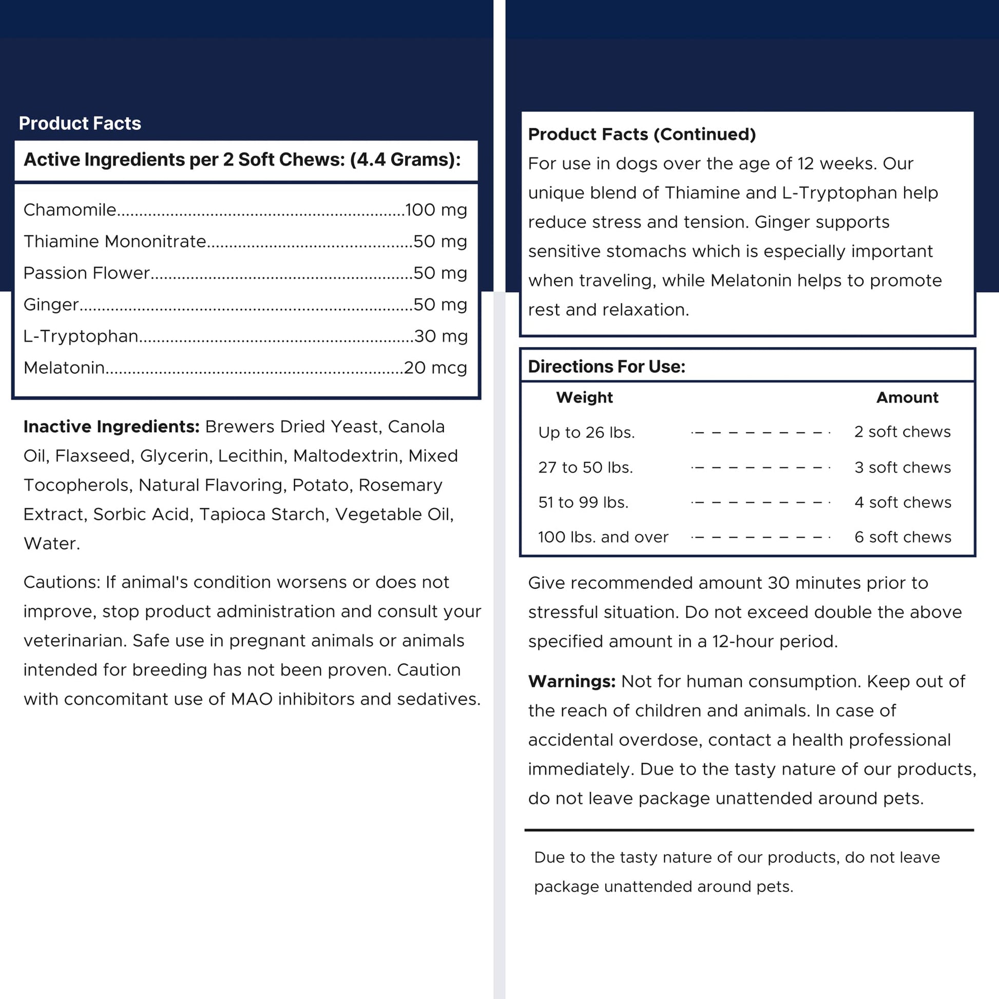 Includes melatonin as a dog sleep aid for help with sleeping and resting, as well as ginger to calm sensitive stomachs.