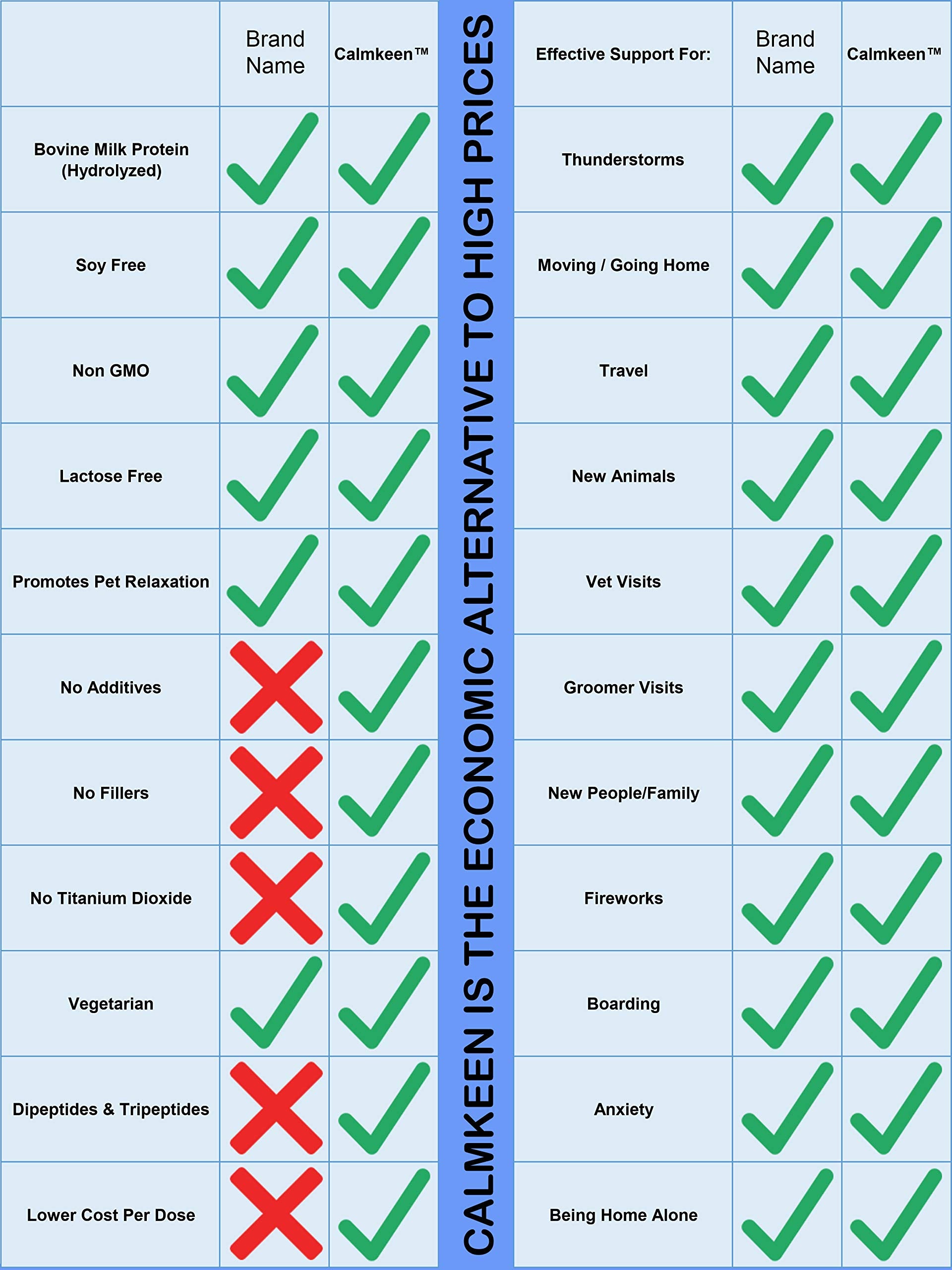 Calmkeen makes no representations that it is related to or is the same as Zylkene. Zylkene is a registered trademark of Vetoquinol USA, Inc. and has no relationship to Calmkeen in any way, shape or form.