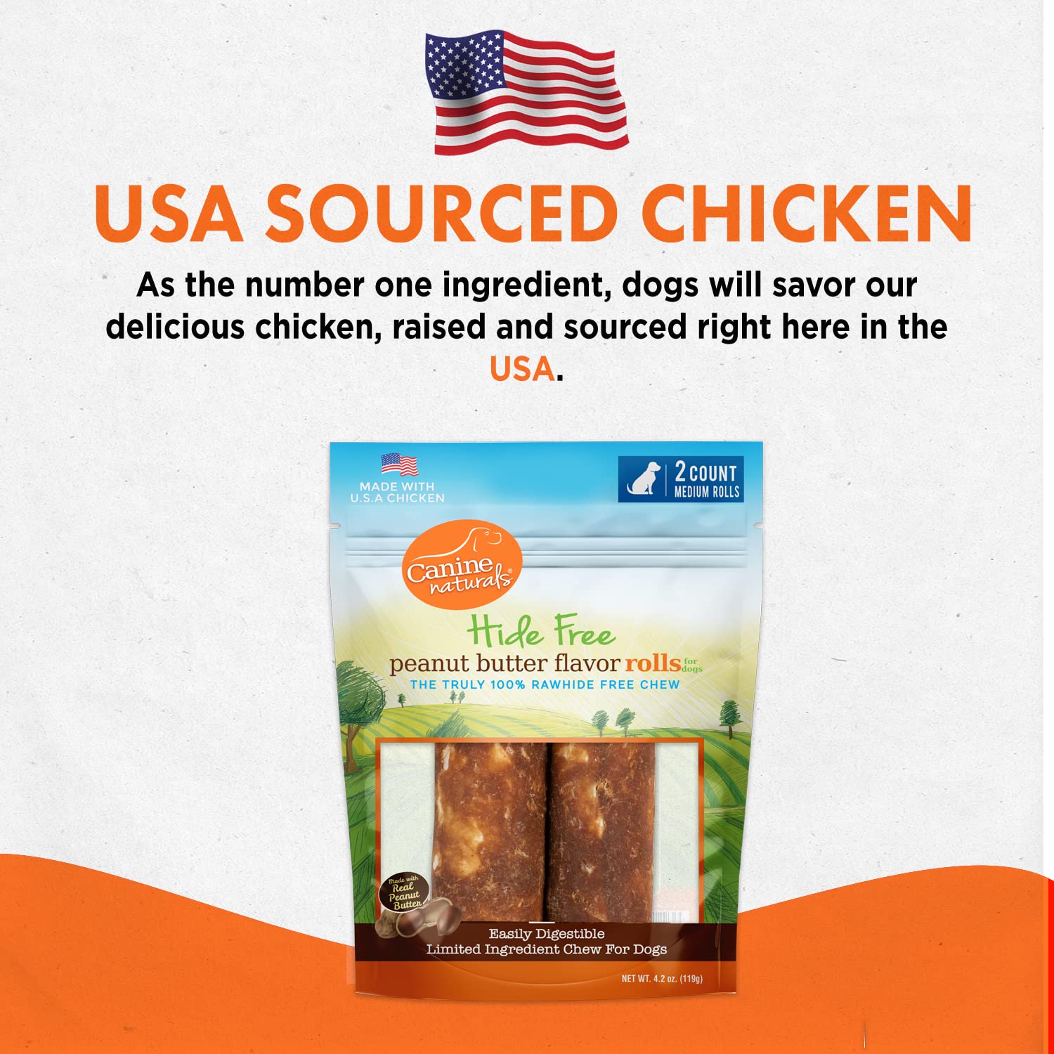 Details: Canine NaturalsⓇ Hide Free Chews are a healthy and delicious alternative to rawhide products. Some brands or product names imply their chews are hide-free, when in fact “collagen” derived from rawhide or some form of animal hide is used in their process. Why? Because animal hide provides a longer chew time for a lower cost as a by-product of other production, which can be difficult for your dog to digest. We proudly state 100% Rawhide Free directly on our packaging. With the 2 pack of our 4” medium chicken rolls, they’ll still enjoy plenty of healthy, safe, and satisfying chew time.** Our limited ingredient recipe is lab proven to be up to 400% more digestible than rawhide based products.* Because we use whole muscle meat and not chicken parts, your dog will enjoy delicious chicken raised and sourced right here in the USA. Made with care and integrity; our healthy chews contain zero artificial flavors, colors, or filler ingredients like corn, wheat, or soy. More than just a tasty treat, the long-lasting chew helps clean your dog’s teeth and gums while satisfying their natural chewing instinct, giving your pet the satisfaction and flavor that rawhides can't! With great flavors and real ingredients, Canine NaturalsⓇ chews are a healthy and rewarding treat that’s sure to please. *In Vitro Hide Free Study Performed by Dr. Maria Godoy at the University of Illinois. **We recommend buying a chew that is larger than your dog’s mouth. A chew that is larger than your dog’s mouth helps ensure they chew and work on the product versus just swallowing it.