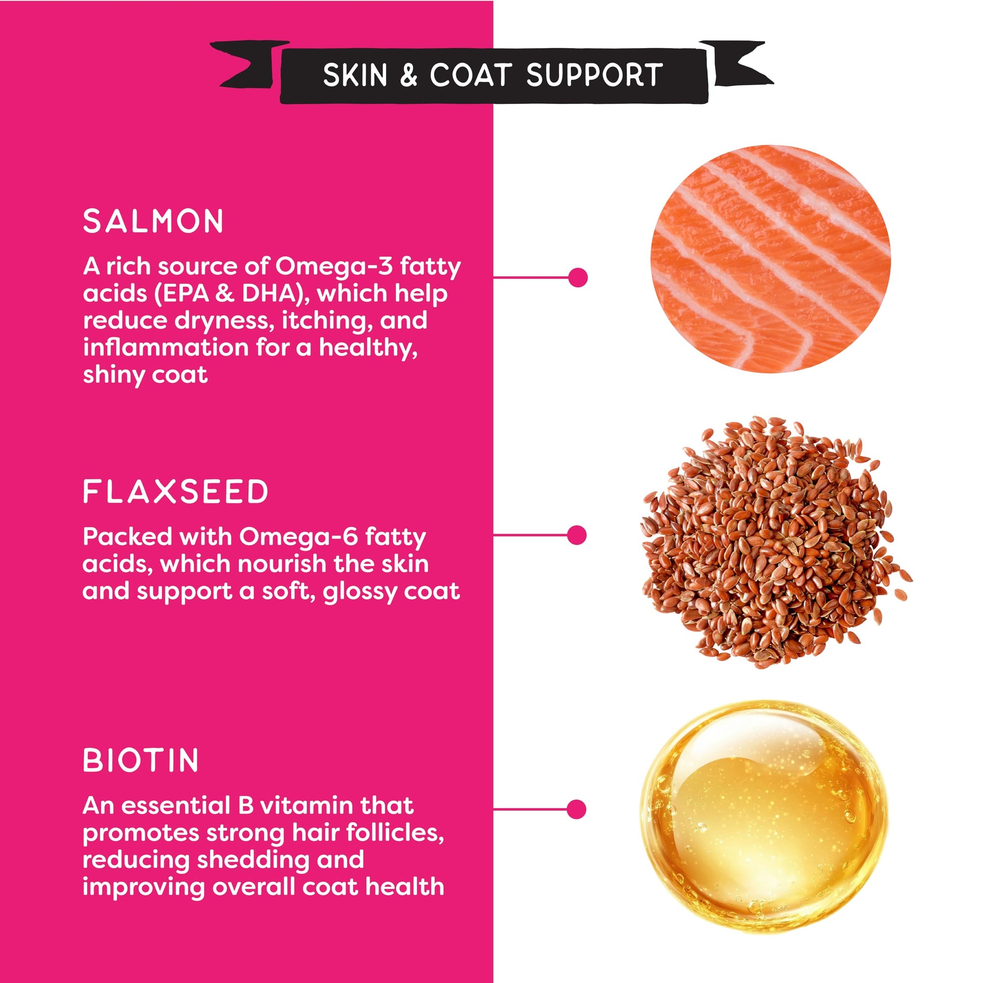 - Skin & Coat Support – Nourishes skin and supports a shiny, healthy coat with a boost of biotin, flaxseed, and omega-3 fatty acids.