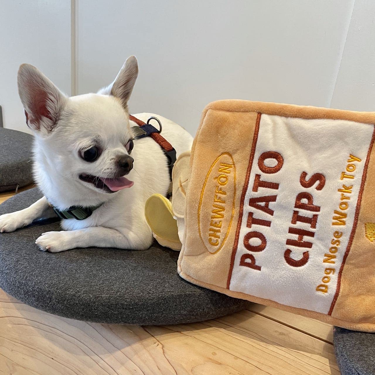 • Interactive Snuffle Toy: Fill the pockets of the hide-and-seek potato chips with treats, put the chips back in the rustling packaging, and hand it to your pup. They’ll be thrilled at first sniff!