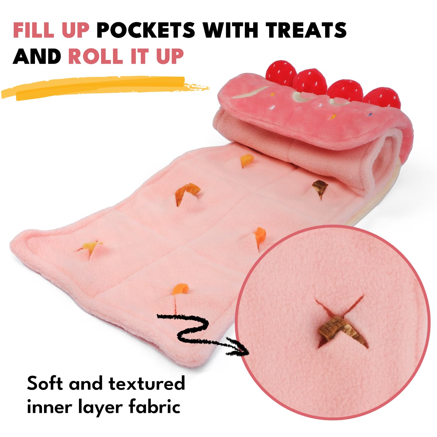 • Treat-filled Fun: Keep your furry friend engaged for hours with the CHEWFFON Dog Puzzle Toy. Featuring a delectable fresh cream and strawberry design on top of a roll cake, with an inner layer of 10 treat pockets, this puzzle toy is perfect for hide-and-seek playtime.
