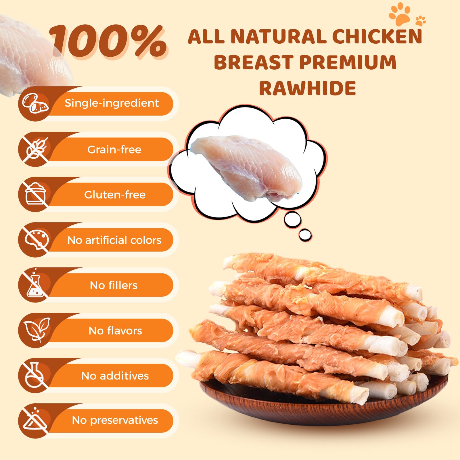 - 1. 100% NATURAL CHICKEN , GRAIN/ADDITIVE-FREE Pure chicken breast wrapped around premium rawhide—zero grains, artificial colors, preservatives, corn or soy. Hypoallergenic and easily digestible for sensitive stomachs. All carefully roasted for optimal quality and delicious flavor.