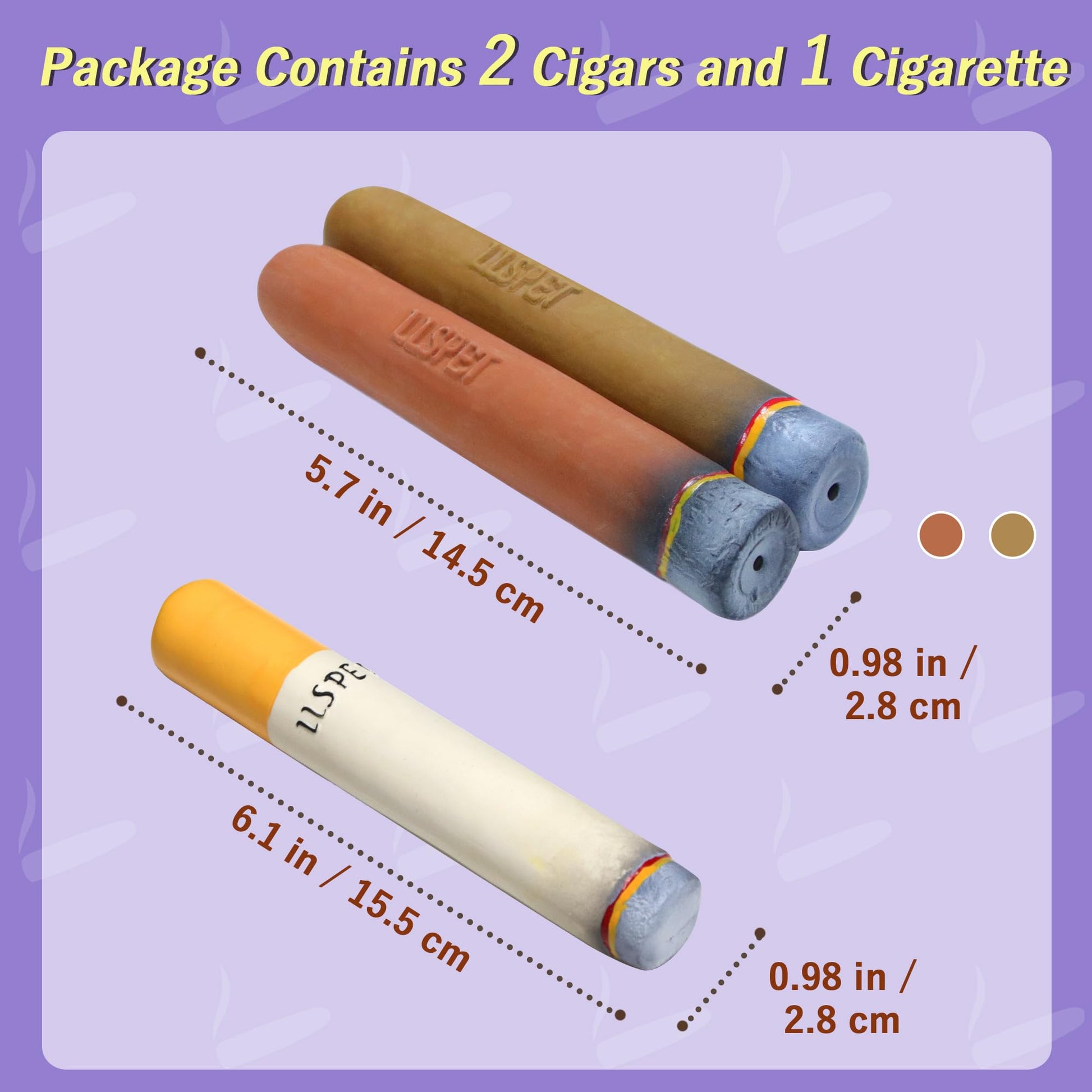 - The size of the cigar toy is 5.7"(L)×0.98"(W) and the cigarette toy is 6.1"(L)×0.98"(W) . These Toys are only for small and medium breeds dog (weighing less than 25 pounds). No for large and aggressive dogs as they may tear the toy and swallow the pieces. Please monitor the wear and tear of the toy and eliminate broken toys in time to protect your pet's health!