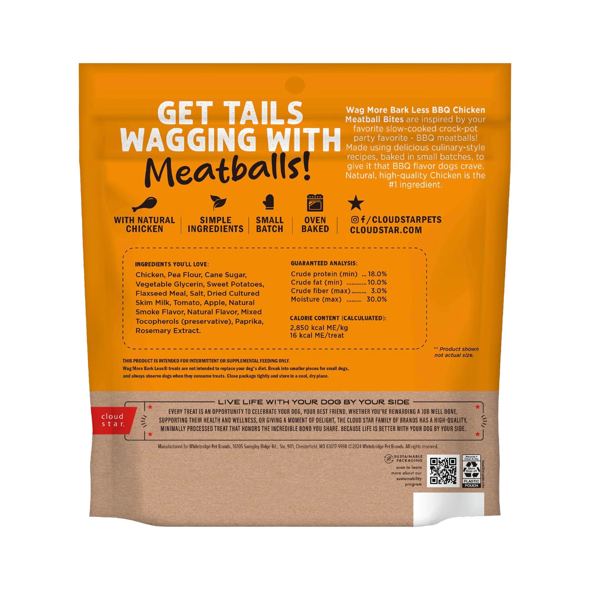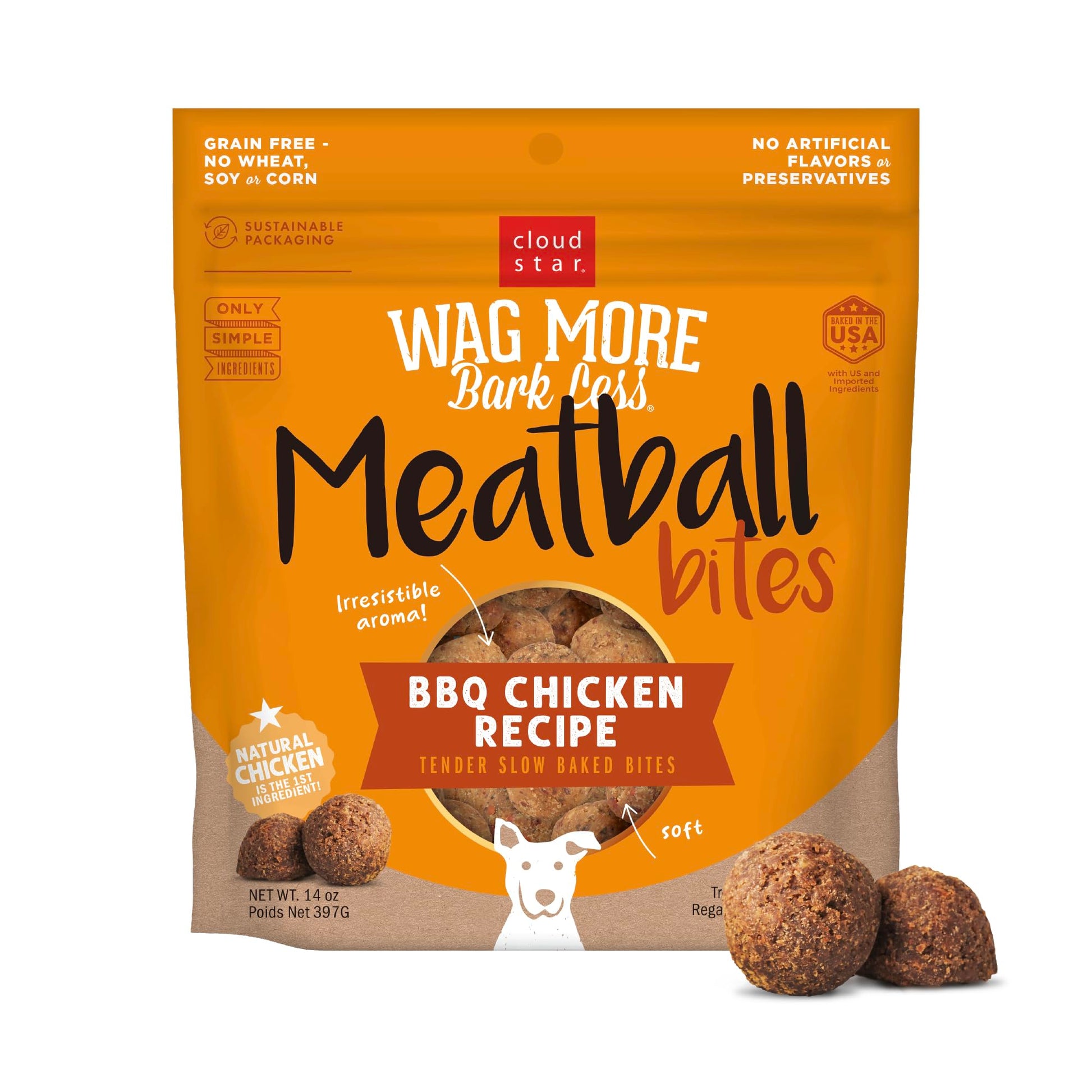 Details: Cloud Star® Wag More Bark Less® BBQ Chicken Recipe Meatball Bites are soft, mouthwatering treats made just how you'd make them: using simple, home-style recipes, real vegetables, and plenty of what makes dogs wag: high-quality USA-sourced chicken.