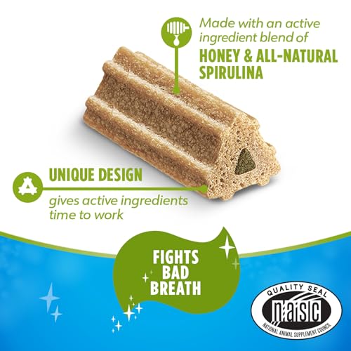 Details: Serve your dog a delicious chicken-flavored CHEW that helps tackle his bad breath at the source with Purina DentaLife ActivFresh Daily Oral Care mini dog CHEWS. These dog dental CHEWS contain scientifically tested ingredients that tackle bad dog breath at its source. Along with delivering a proprietary active-ingredient blend of honey and all-natural spirulina, these small dog CHEWS taste great and contain no artificial flavors, colors or preservatives. Dogs love the chewy texture of these mini CHEWS, and the small size is just right for his little mouth to manage. Each of these dental CHEWS for small dogs features nine distinct ridges for an intriguing texture that keeps your dog interested as he chews. Toss him one of these chicken dog CHEWS to reward him for being a good boy, or give him one every day as part of his regular oral care routine. Purina DentaLife ActivFresh Daily Oral Care mini dog CHEWS provide a taste he loves and the results you appreciate.