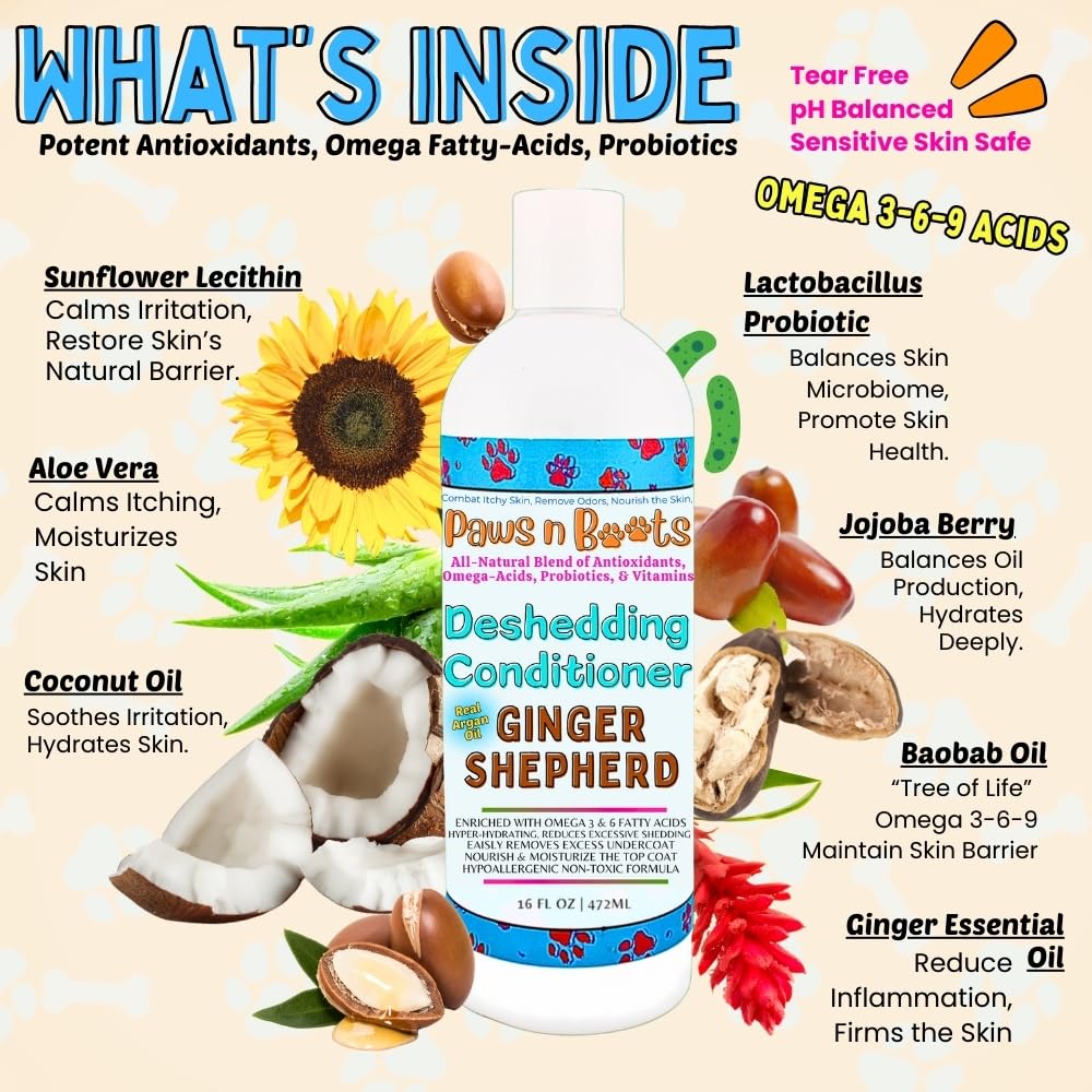 Deshedding Conditioner Omega Fatty Acids 3 6 9. Real Argan Oils All-Natural, Organic, & Non-Toxic to Pets Condition, Hydrate, & Nourish the Coat. Hypoallergenic, Tearless, Control Odor Made in USA 16oz Ginger