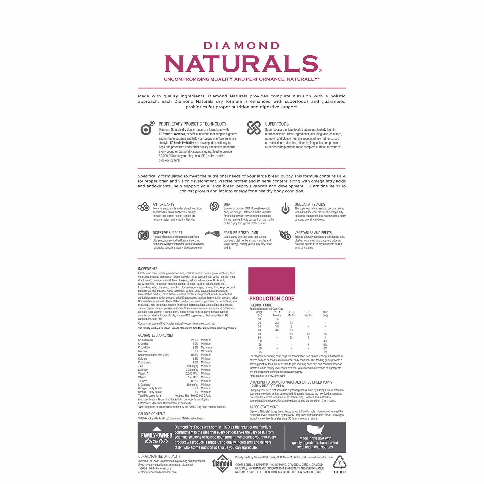 Details: Proper levels of protein, fat, calories and minerals will help your large breed puppy grow and thrive. Calcium and phosphorus provide ideal bone and joint development, and the addition of L-carnitine helps convert fat to energy and develop lean body condition and strong bones. Diamond Naturals Large Breed Lamb & Rice Puppy Formula Dry Dog Food also contains DHA for optimal brain and eye development.