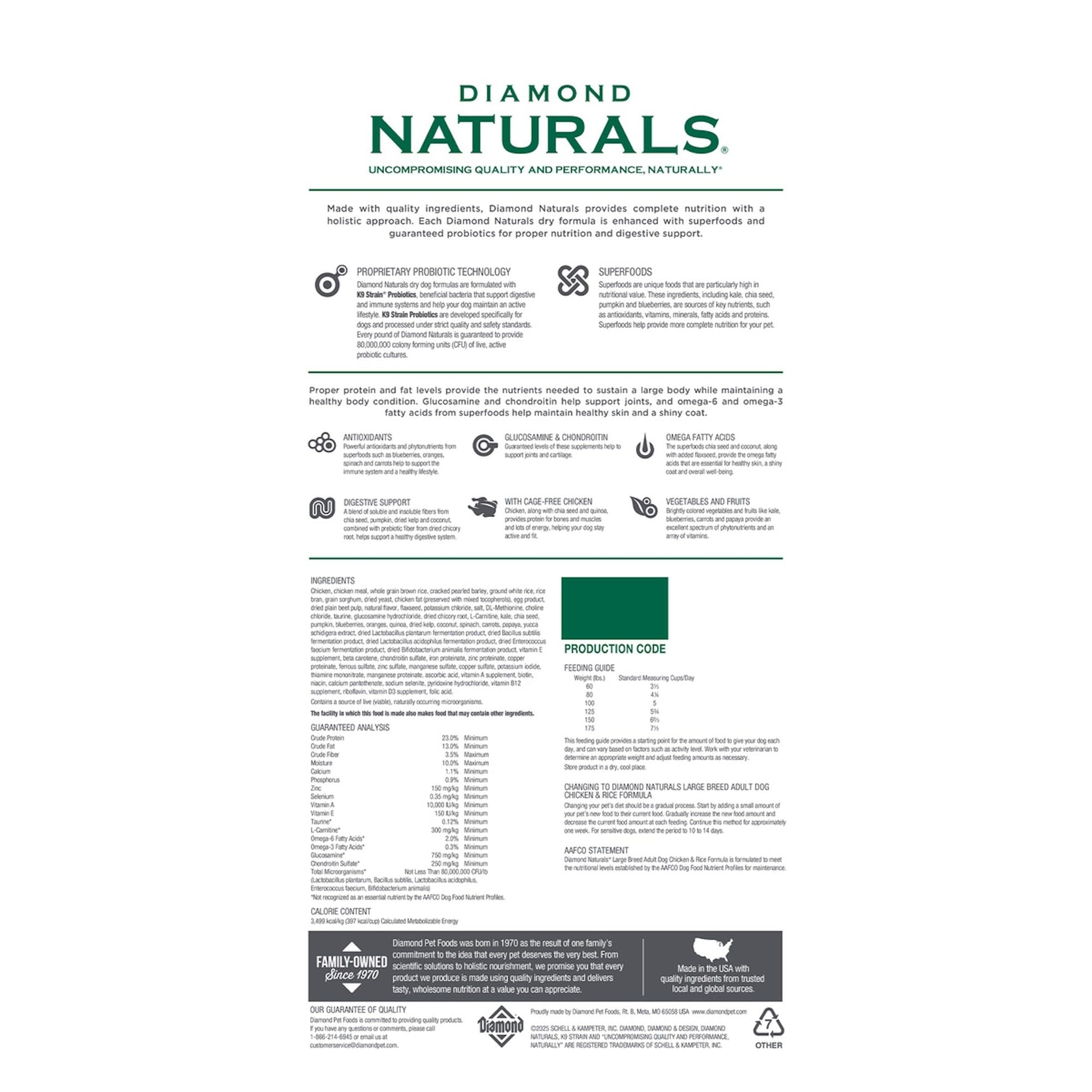 - Diamond Naturals Large Breed Adult Dog Chicken and Rice dry dog food; REAL CAGE-FREE CHICKEN is the #1 ingredient; specially formulated to support the needs of LARGE BREED DOGS