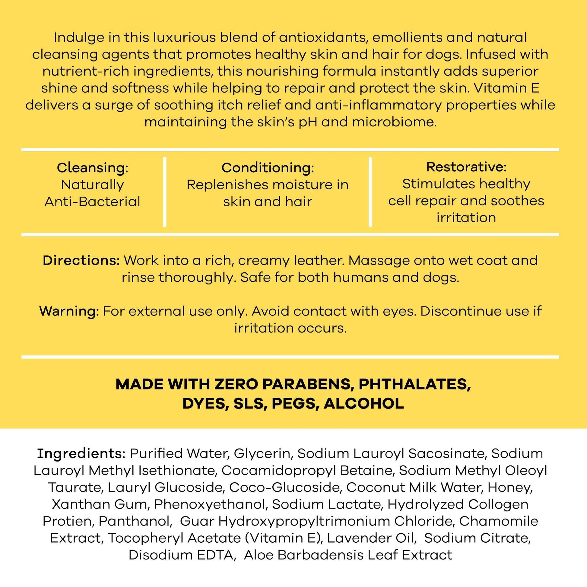 • Anti-Itch Relief: Alleviate discomfort for your dog with soothing Anti-Itch Shampoo & Body Wash. This comprehensive elixir includes Panthenol (Provitamin B5), Vitamin E, Coconut Milk, and Chamomile to bring gentle relief to itchy skin, perhaps agitated from low-quality shampoos or sprays. This strengthening blend has a pH level of 7, making it ideally balanced for delicate dog complexions. Look forward to a comforted pup with shiny, hydrated skin and coat.