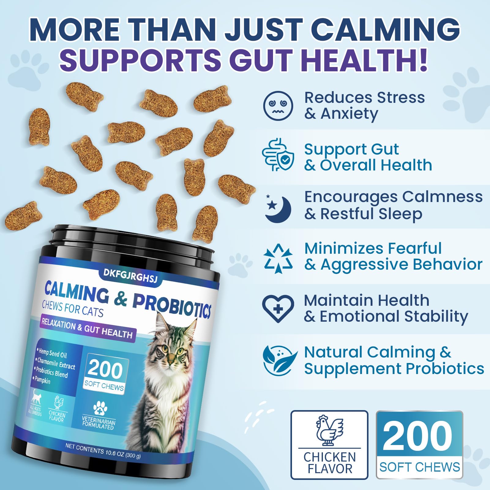 DKFGJRGHSJ Cat Calming Treats, 200 Soft Chews Hemp Calming for Cats Gut Health with Probiotics, Calm Cat Treats for Anxiety and Stress Relief & Probiotic for Cats Digestive Health Chicken Flavor