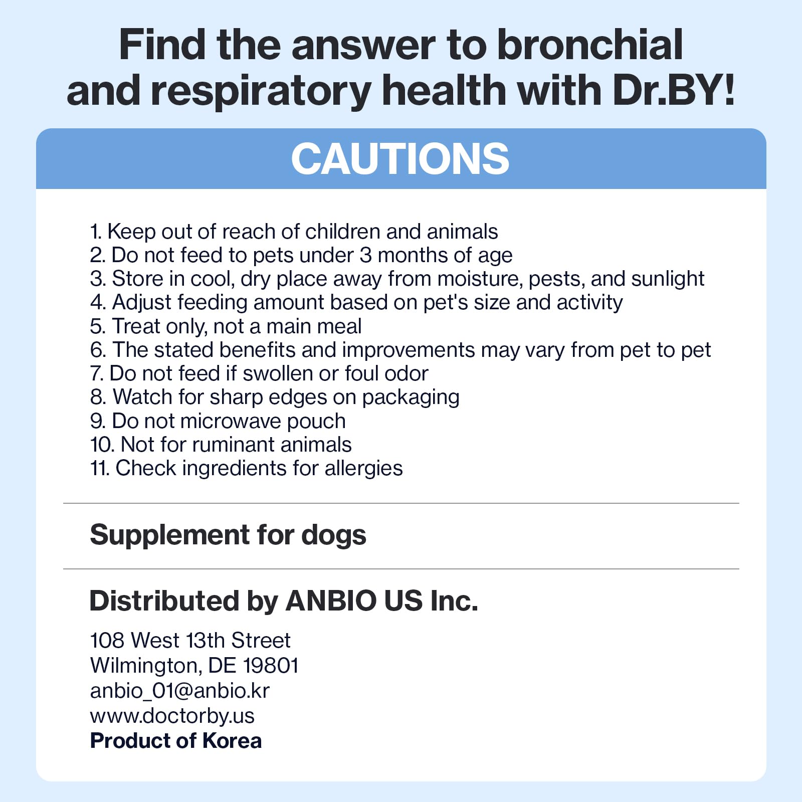 - [Bronchial and Respiratory health support] We develop Dr.BY Breath Care focusing on dog's bronchial and respiratory health improvement. This product contains TF-343, Magnesium, Propolis, Chitosan, Chlorella.