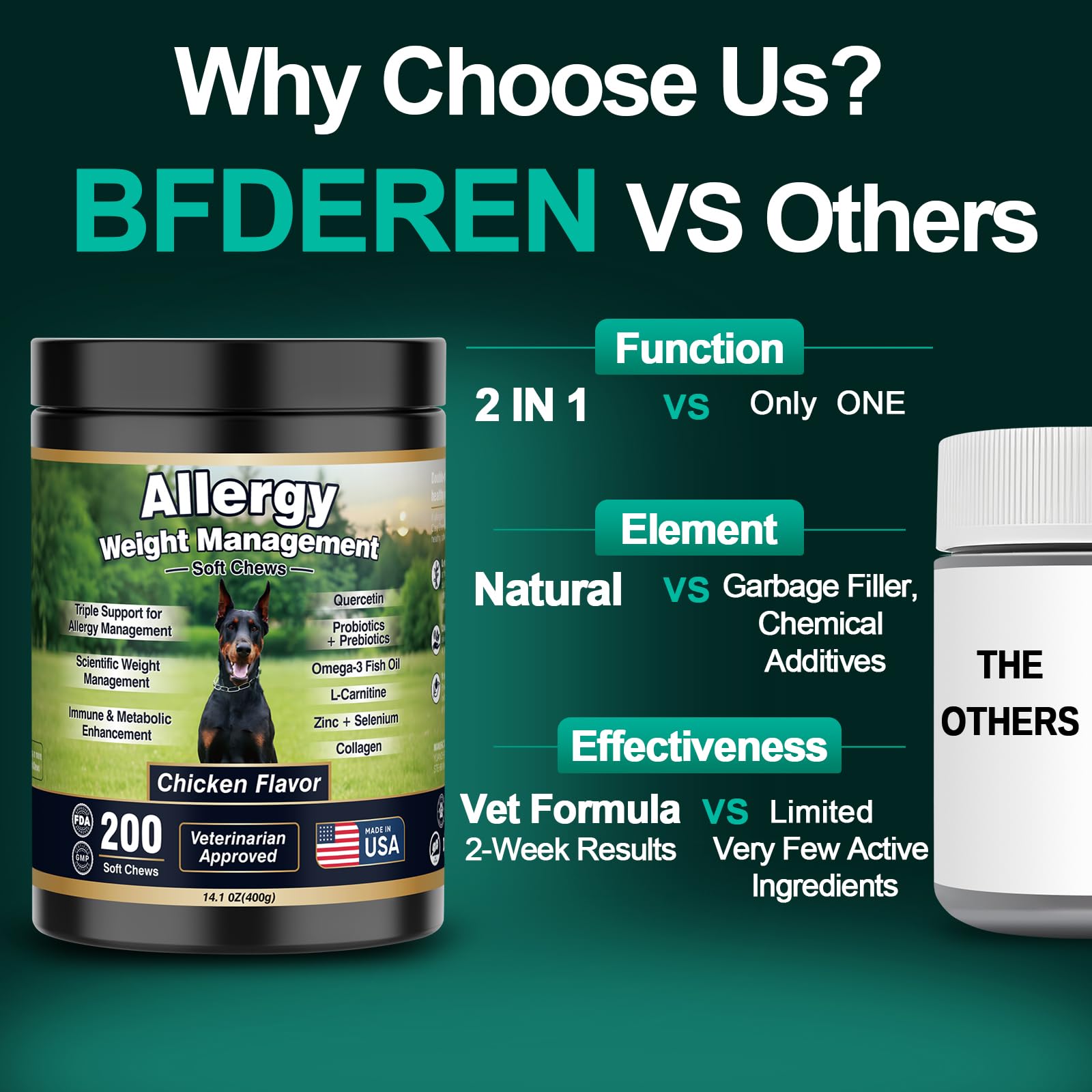 - [Dog Allergy Relief + Support Healthy Weight] Dual-Action Dog Allergy Chews address dog allergy & weight management at the same time. Dog itching skin relief,dog dermatitis treatment,strengthen dog skin barrier by regulating histamine levels with quercetin for dogs.Natural Metabolism Support Ingredients promotes Healthy Fat Metabolism & Controls Appetite, for effective weight management.Perfect for allergy dog with overweight,dog allergy medicine provide comprehensive care