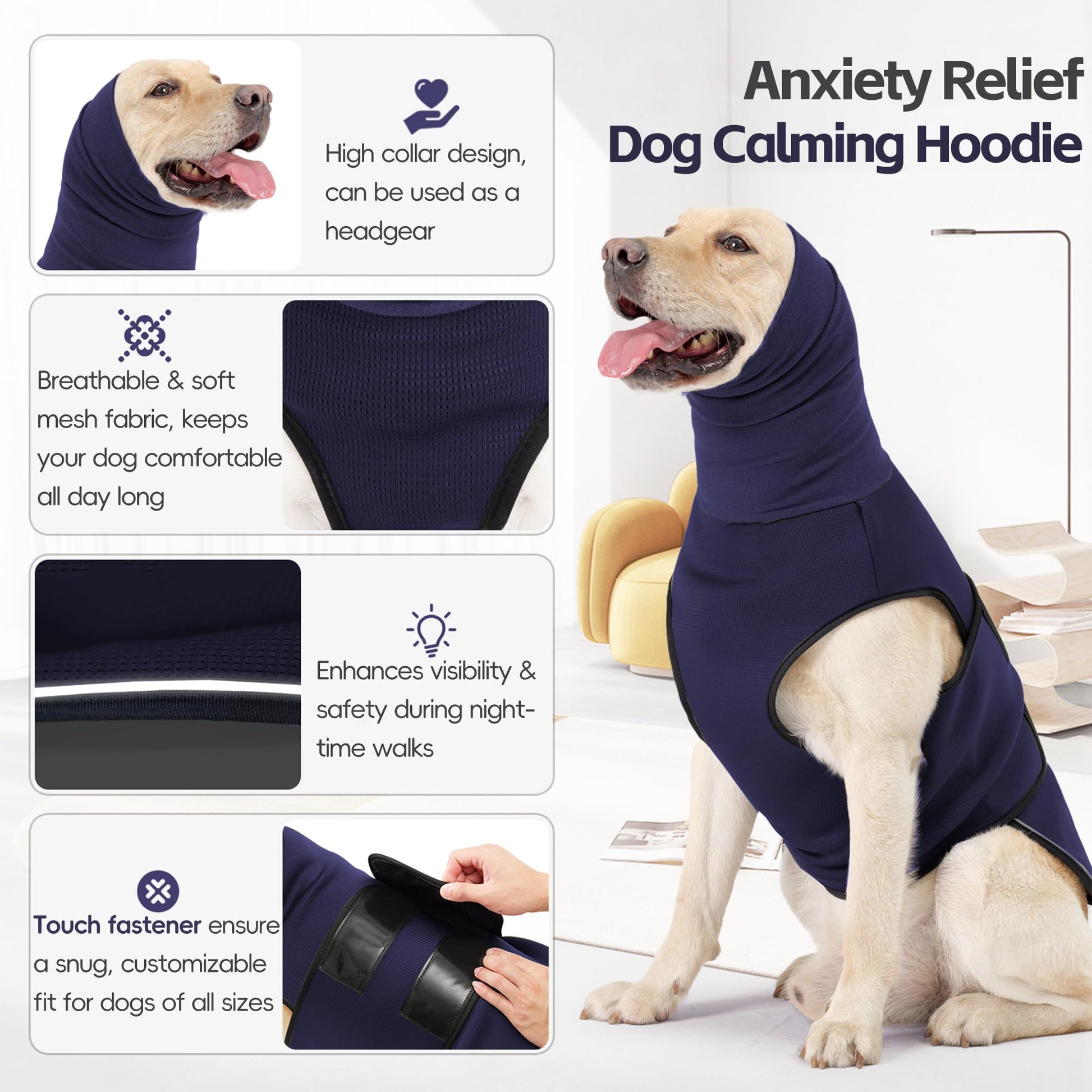 Dog Anxiety Jacket, Breathable Dog Anxiety Relief Vest Shirt, 2-in-1 Large Doggy Calming Hoodie with Ears Wrap for Thunderstorms, Fireworks, Vet Visits, Separation, Noise Protect Recovery (Blue, XL)
