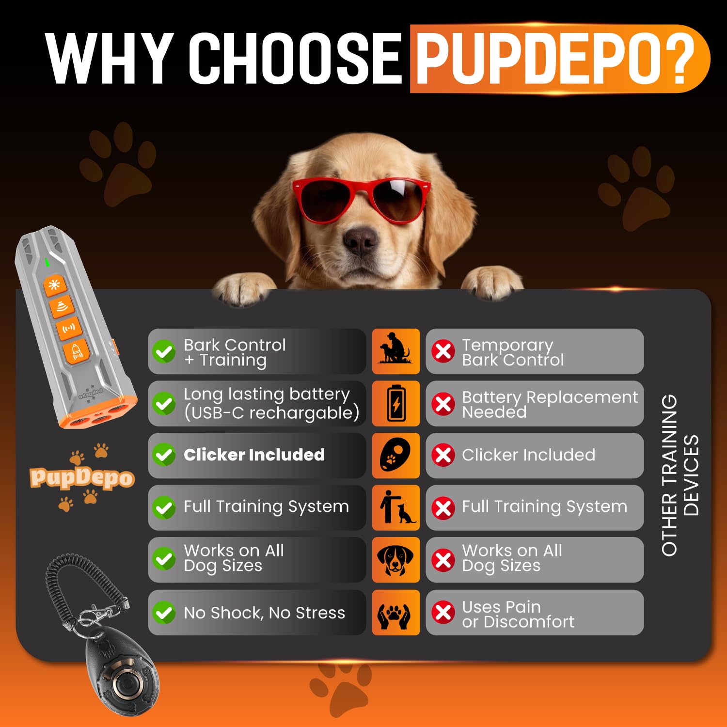 🐶 Effective Bark Control and Training: 3-1 Training tool utilizes advanced ultrasonic technology to deter excessive barking for all dog sizes promoting good behavior and a quieter environment. With just one click it can help prevent dogs from barking, digging, scratching, biting, climbing on furniture and other unwelcome behaviors.