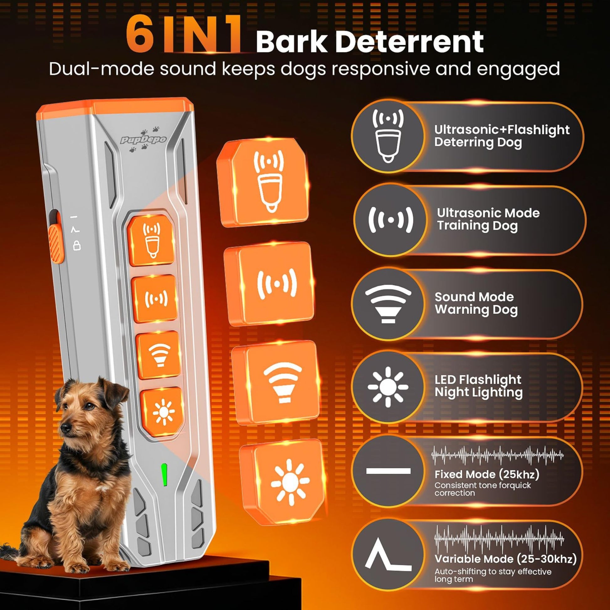 🌟 Multi-Mode Functionality: Includes 4 adjustable modes and 2 Ultrasonic frequencies - Ultrasonic Mode, Ultrasonic+Flashlight Mode, Sound Mode, LED Flashlight Mode - 25KHZ fixed frequency and 25KHZ to 30KHZ variable frequency - to cater to different training needs and dog sensitivities.