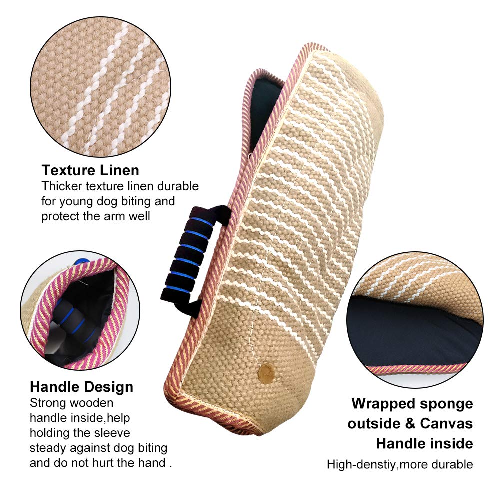 ★ DURABLE & STRONG Dog Bite Sleeve: Crafted with a sturdy jute outer layer, thick foam inner layer, and an interior foam-covered handle, ensuring essential support and protection against forceful bites.