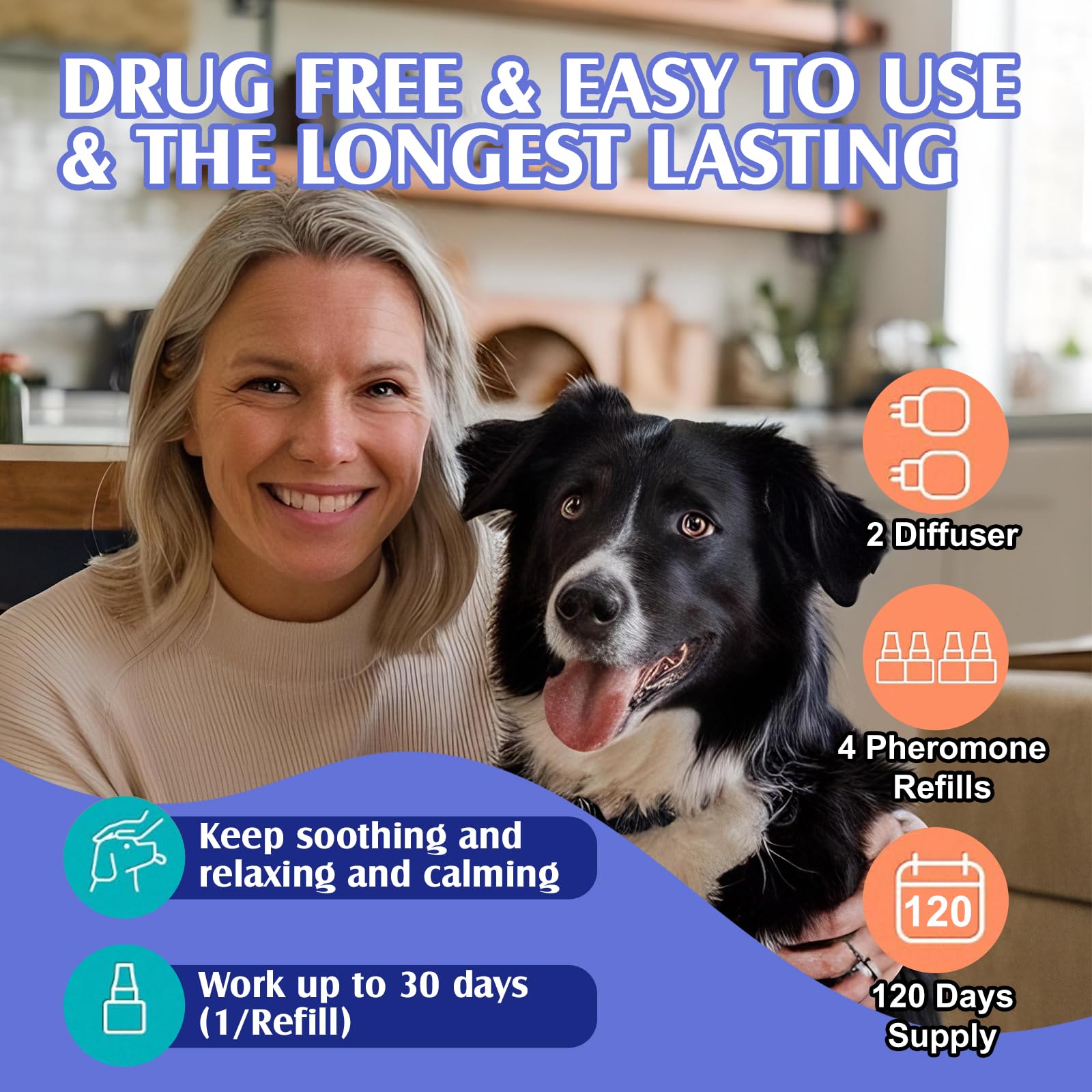 Dog Calming Pheromones Diffuser, 6 in 1 Kit Appeasing Pheromone Diffuser to Calm Dogs, Dog Anxiety Relief Lasting 120 Days with 2 Diffuser + 4 48ml Refill