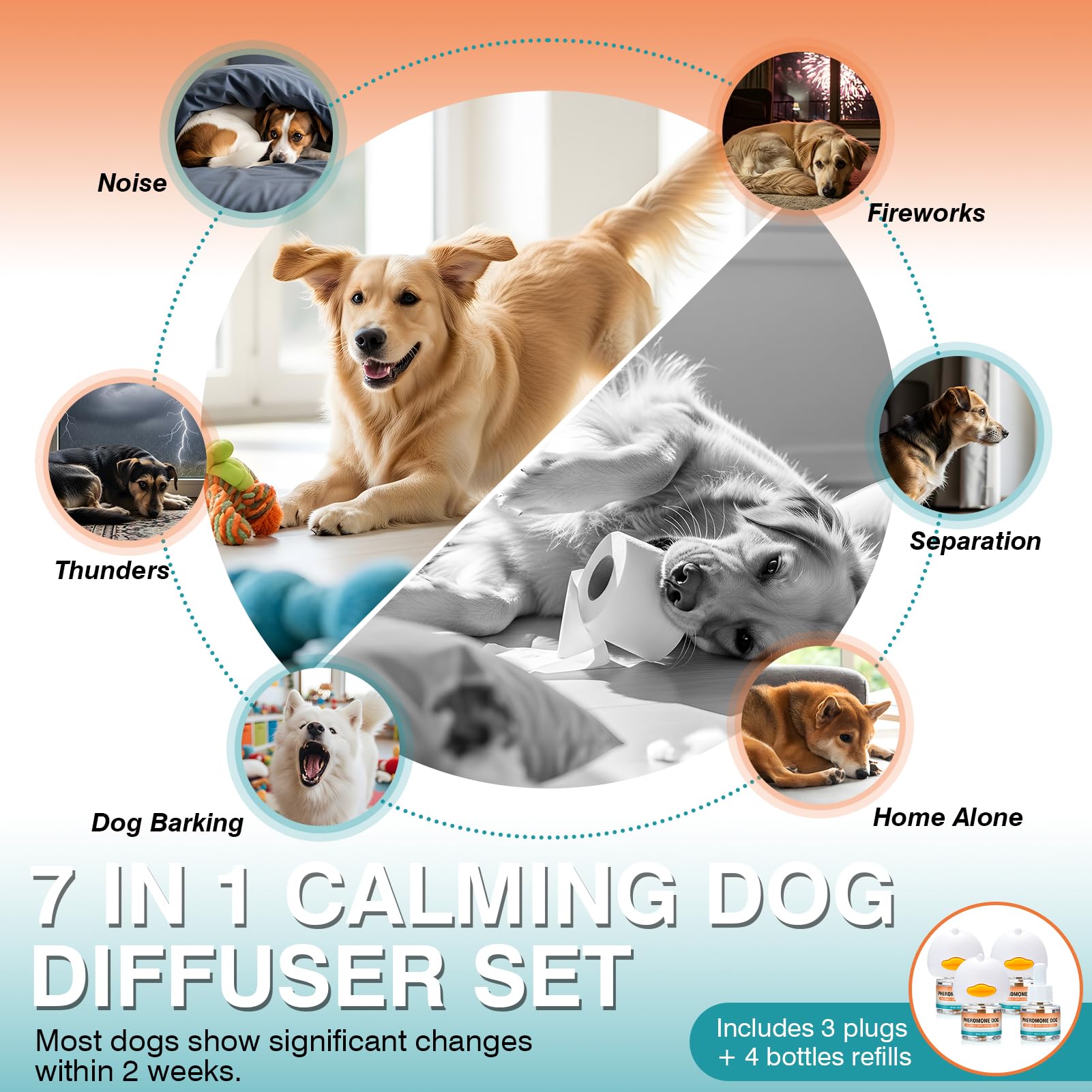 Dog Calming Diffuser That Works In 2 weeks: Dog pheromones calming diffuser provides a effective solution to your dog's anxiety problems. Most pet owners reported that after using calming plug in for dogs for 2 weeks, the dog's barking was reduced, and even the destructive behavior caused by separation anxiety was significantly alleviated. Pheromone diffuser helps dogs regain peace of mind. Note: The effect of dog diffuser may vary depending on the dog's temperament and living environment