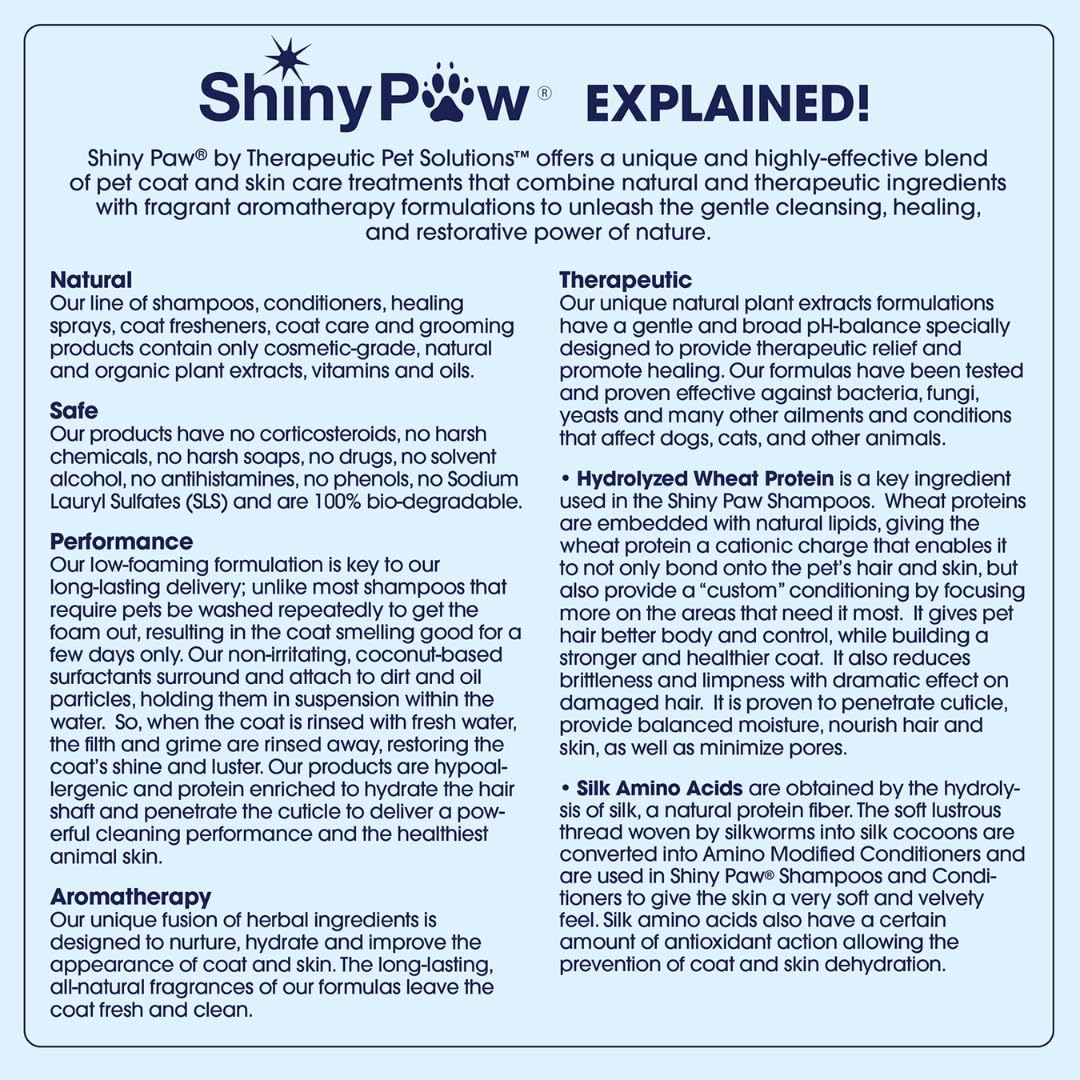 • UNIQUE NATURAL FORMULAS SINCE 2007 – Proudly 100% MADE IN THE USA. Shiny Paw's natural pet products are environmentally safe, soap and detergent free. Formulated for sensitive skin, our formula contains high quality & all natural ingredients.
