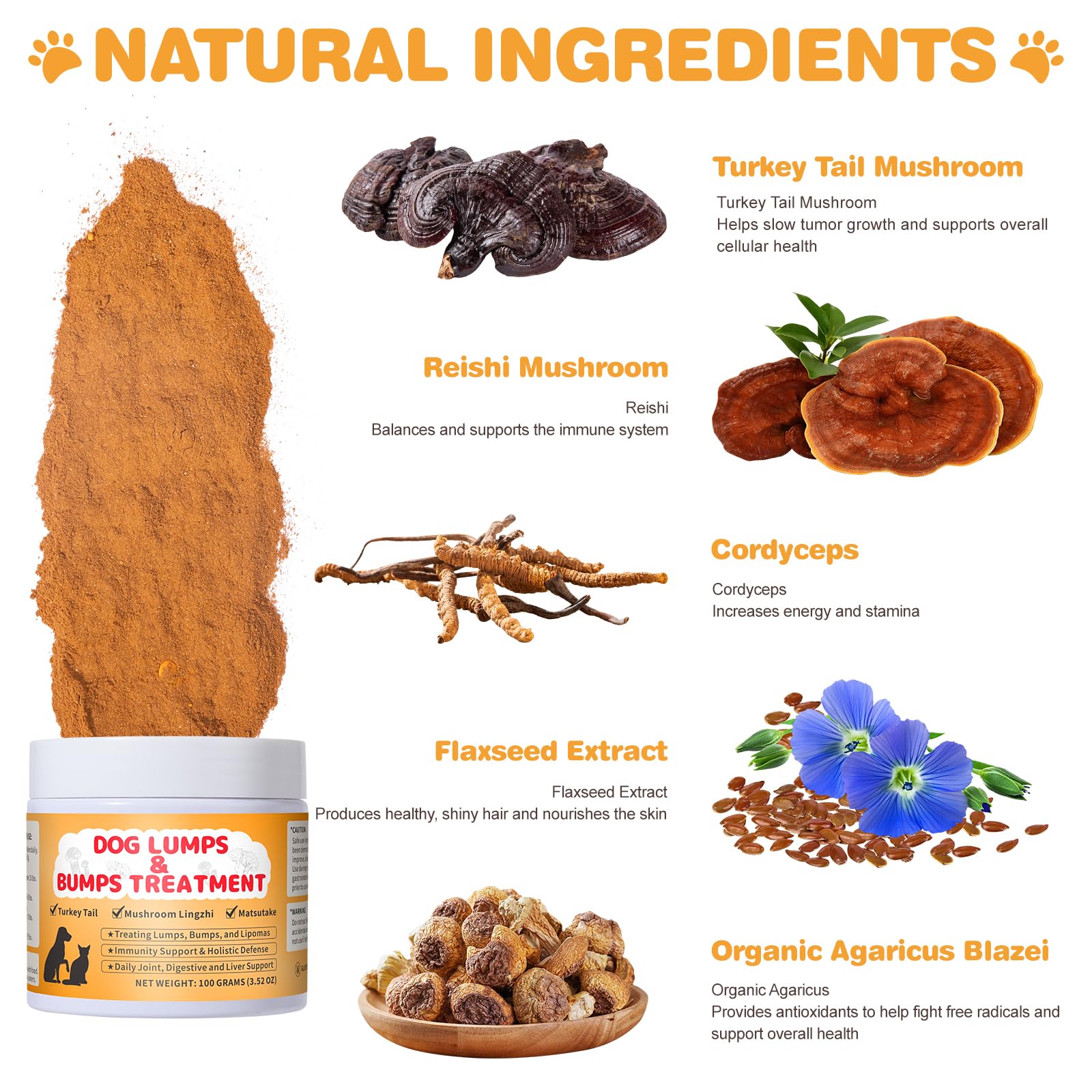 - Natural Ingredients: Your dog deserves quality products. That's why our treatment for dog lumps use real ingredients (turkey tail mushroom, reishi, matsutake, cordyceps), no ingredients derived from corn or grains, no artificial flavors or colors