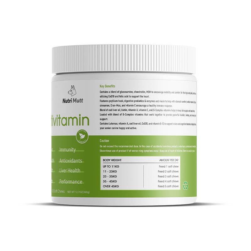 Details: 8-in-1 Nutri Mutt support canine companions in eight great ways! These functional supplements support hip and joint function, heart health, skin health, the immune system, antioxidant levels, liver health,and performance for adult and even senior dogs --small, medium, or large, and regardless of breed. Best of all, these chews taste delicious (trust us, we have a hot spot where our official four-legged testers tell us) that’ll give an itch for more, and pet moms and dads can let out a sigh of relief knowing that their canine will get the multifunctional support they need. That's because this chewable functional supplement contains premium ingredients such as Glucosamine, Chondroitin, a Gut Health Blend, Omega 3 (from Cod Liver Fish Oil), MSM, vitamins, and a whole lot more. Pets bring us so much joy, so it’s our mission to make their lives as happy as they make ours! That’s why Nutri Mutt products are made with premium ingredients and amazing flavors to keep your bestie feeling amazing.